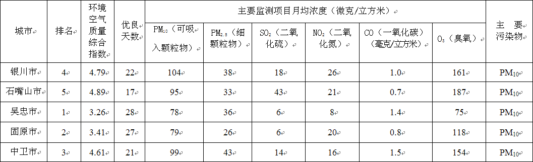 2015年6月宁夏5市环境空气质量状况排名