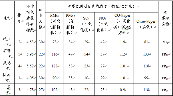 2015年10月宁夏5市环境空气质量状况排名