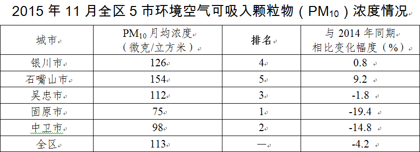 2015年11月宁夏5市环境空气质量状况排名
