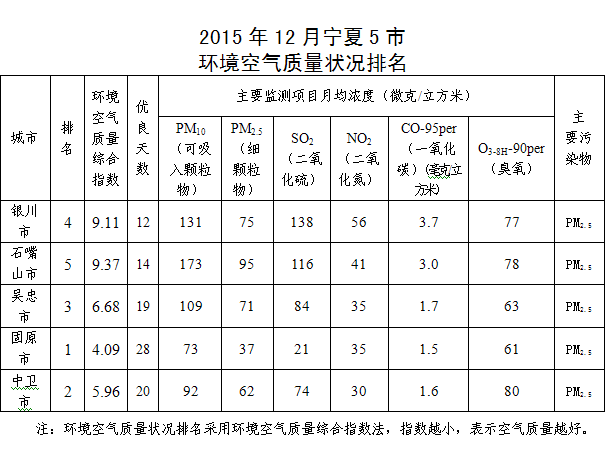2015年12月宁夏5市环境空气质量状况排名