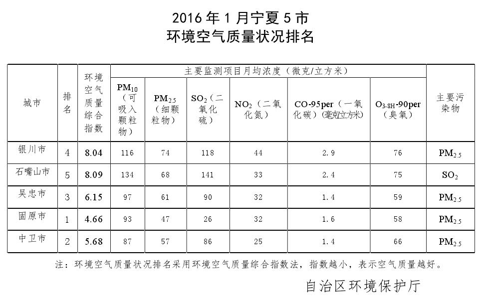 2016年1月宁夏5市环境空气质量状况排名