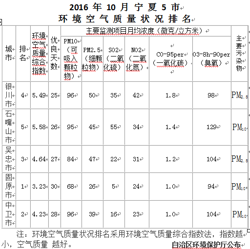 2016年10月宁夏5市环境空气质量状况排名