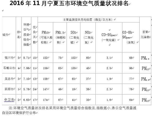 2016年11月宁夏5市环境空气质量状况排名