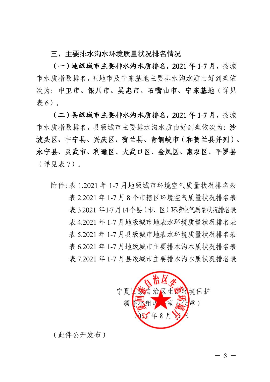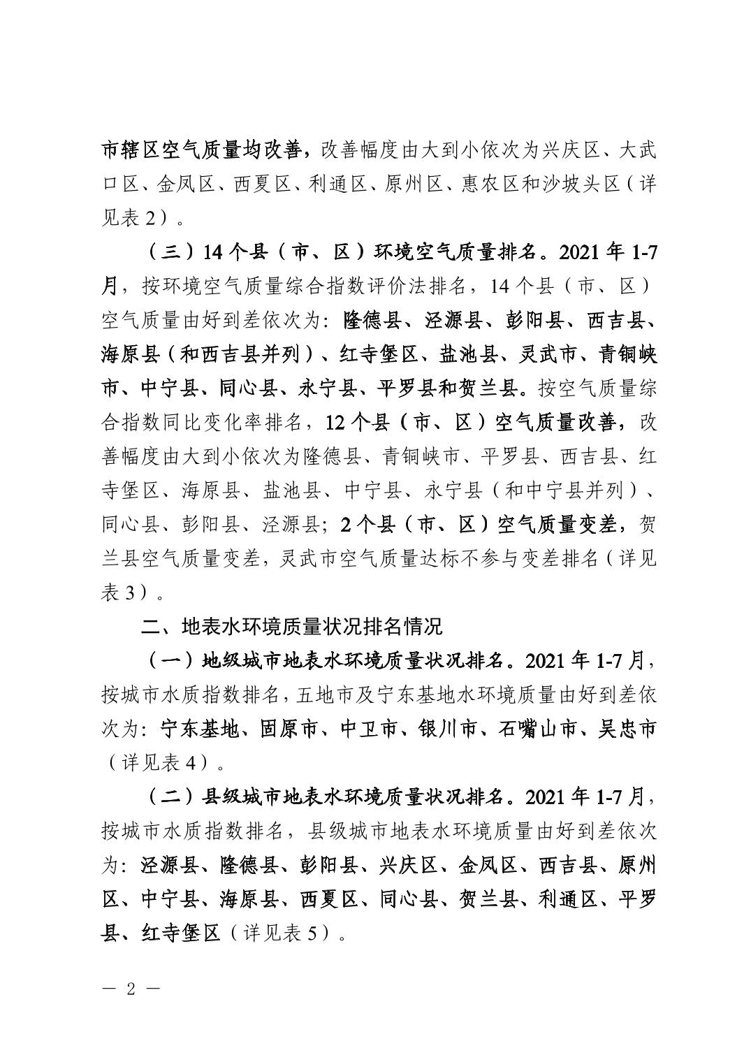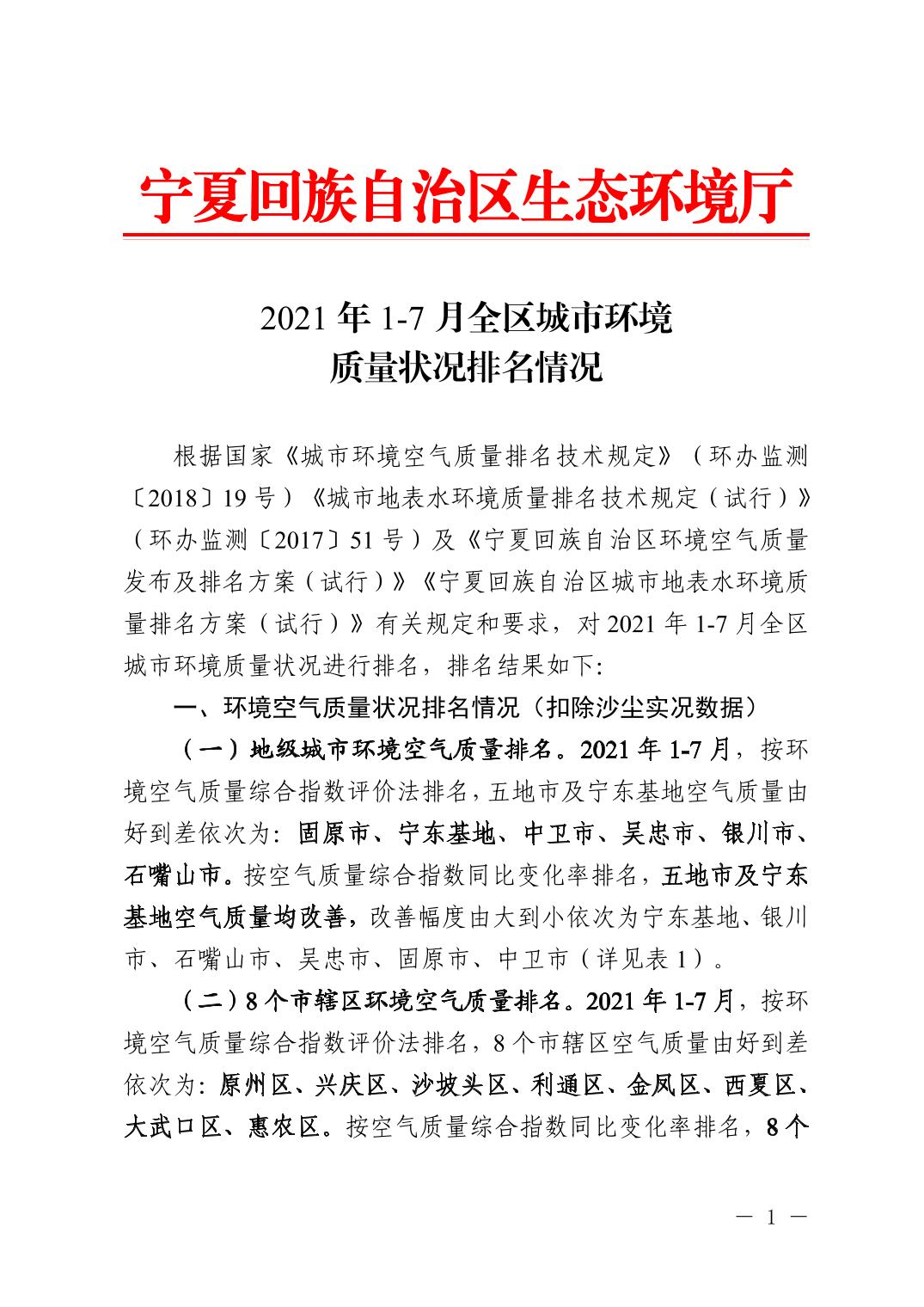 2021年1-7月全区城市环境质量状况排名情况