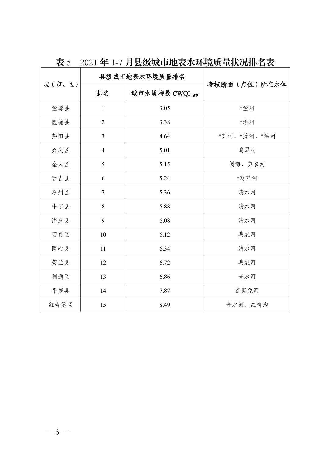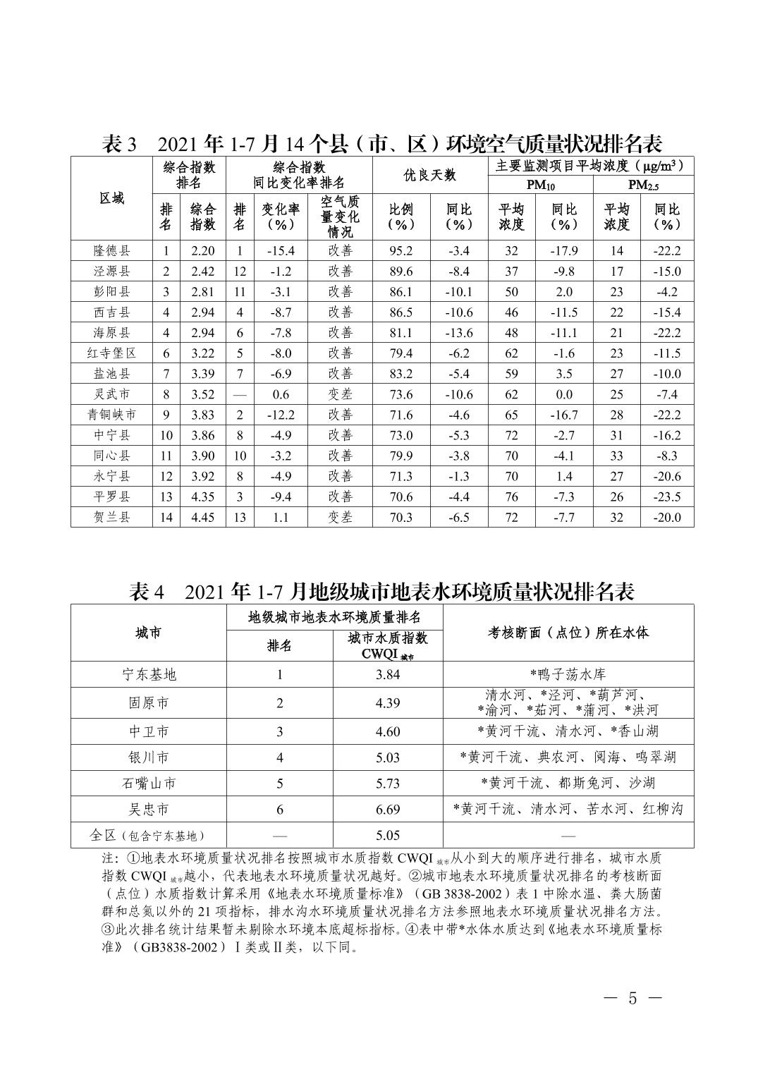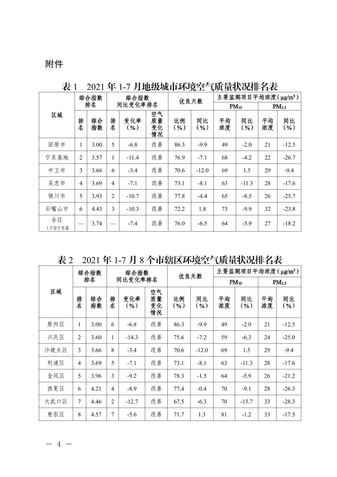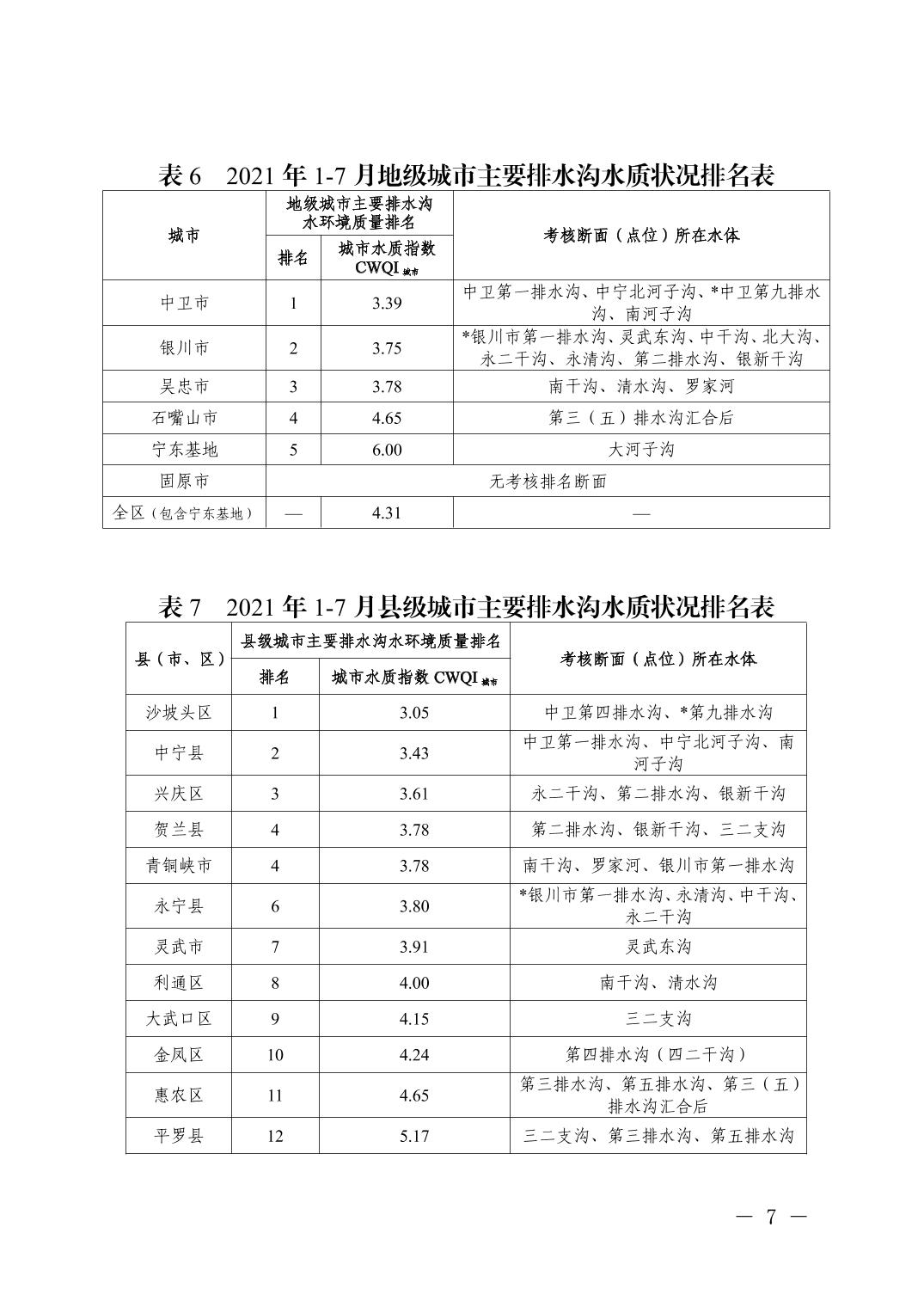 2021年1-7月全区城市环境质量状况排名情况