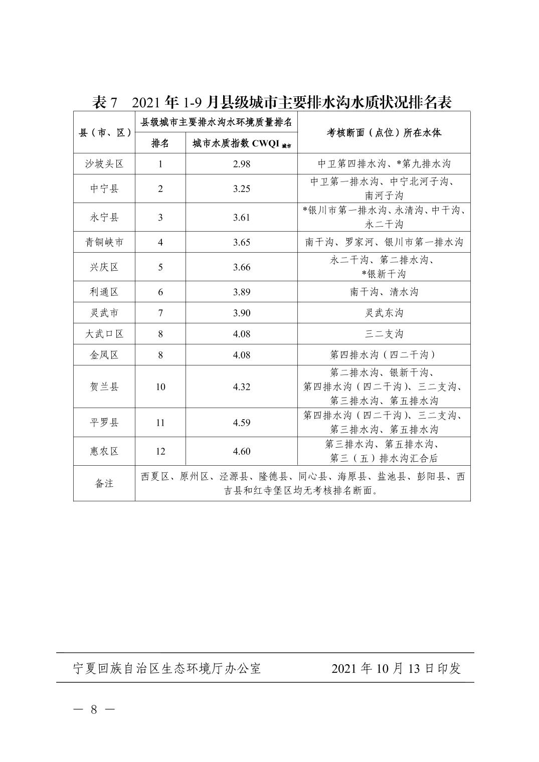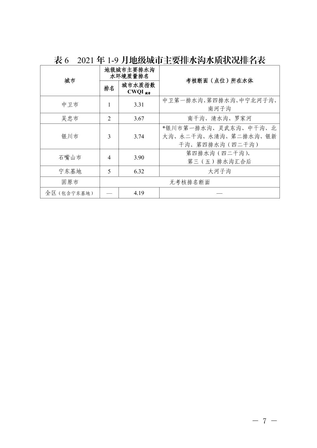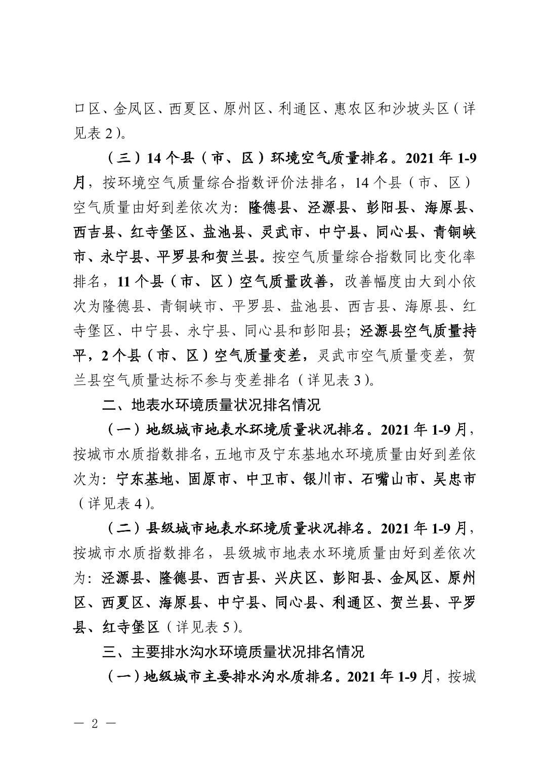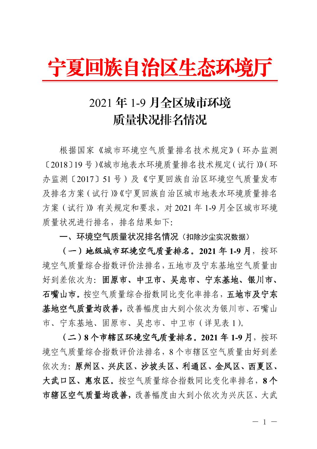 2021年1-9月全区城市环境质量状况排名情况