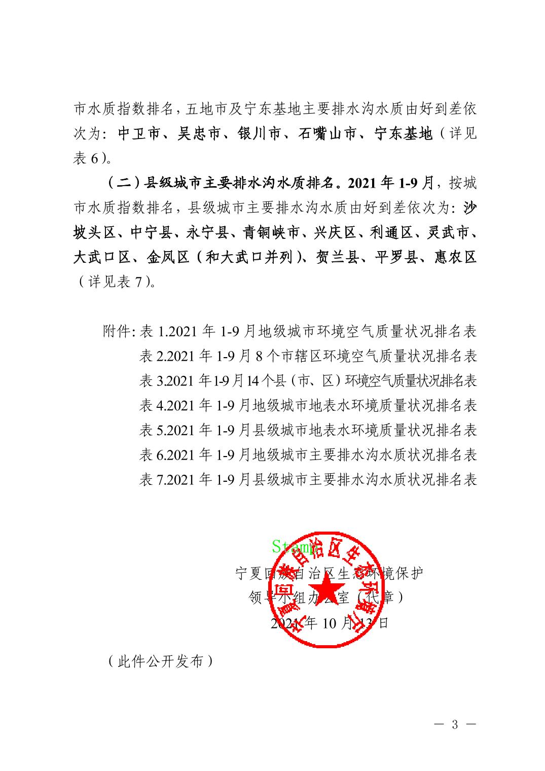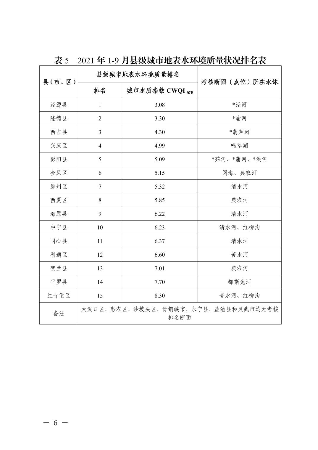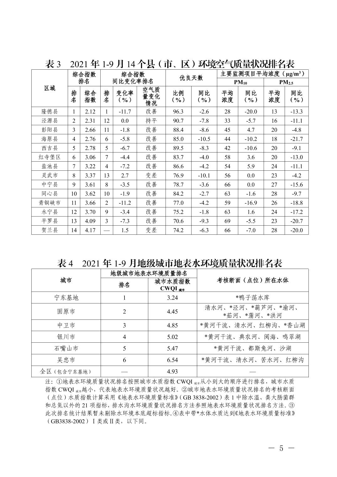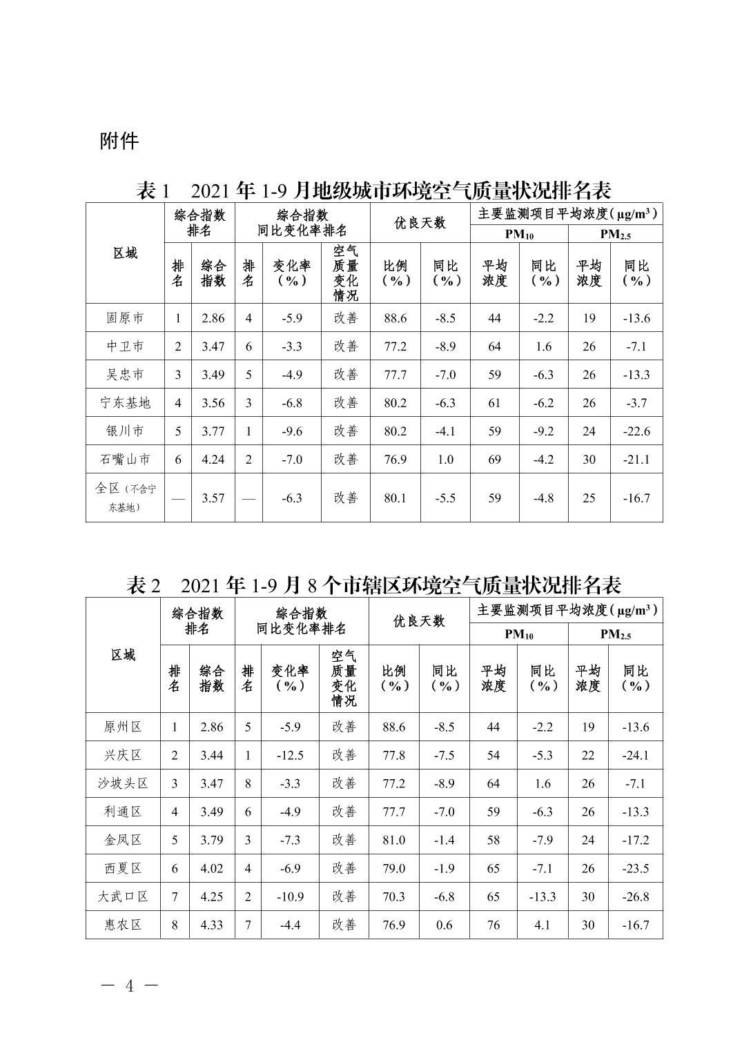 2021年1-9月全区城市环境质量状况排名情况