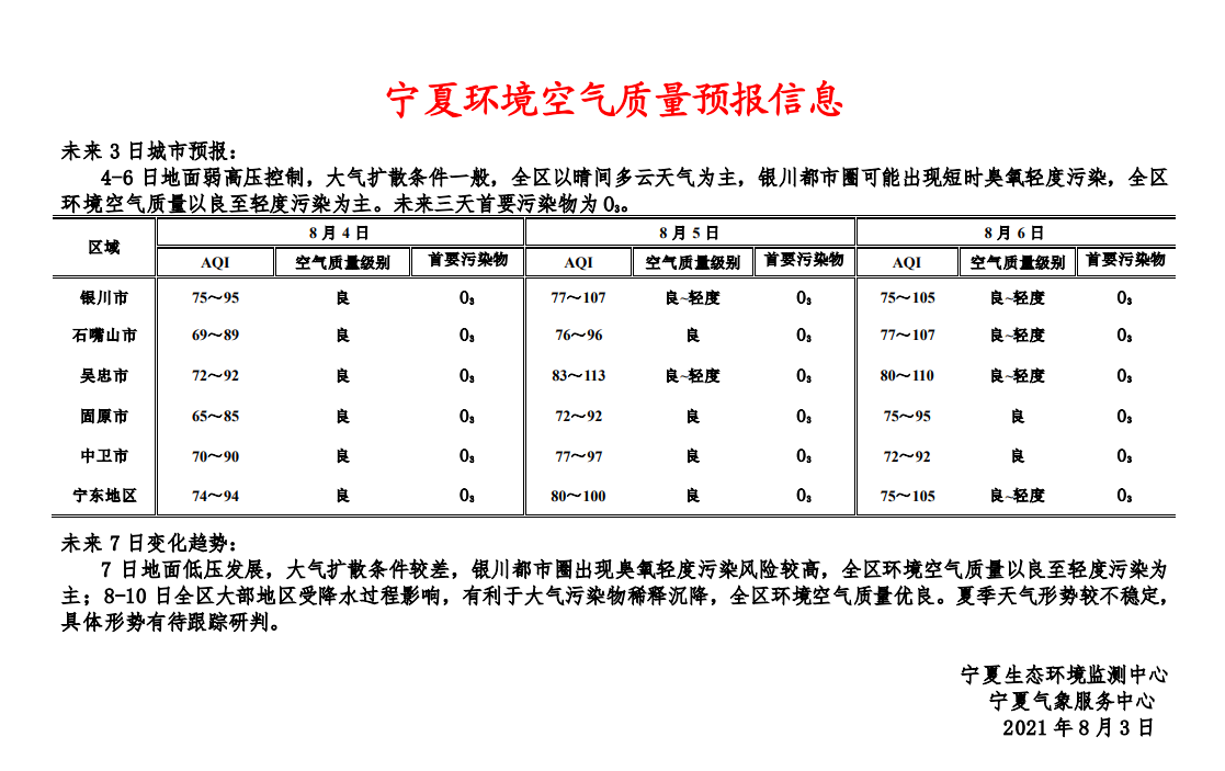 2021年8月3日宁夏环境空气质量预报信息