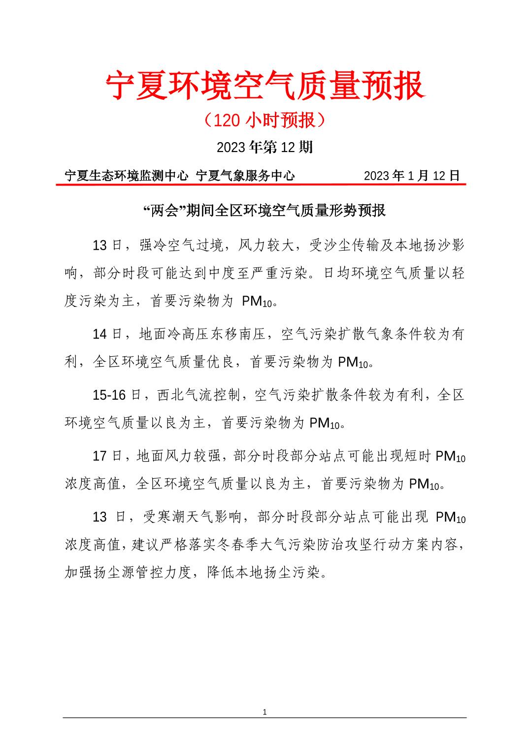 2023年1月12日宁夏环境空气质量预报信息