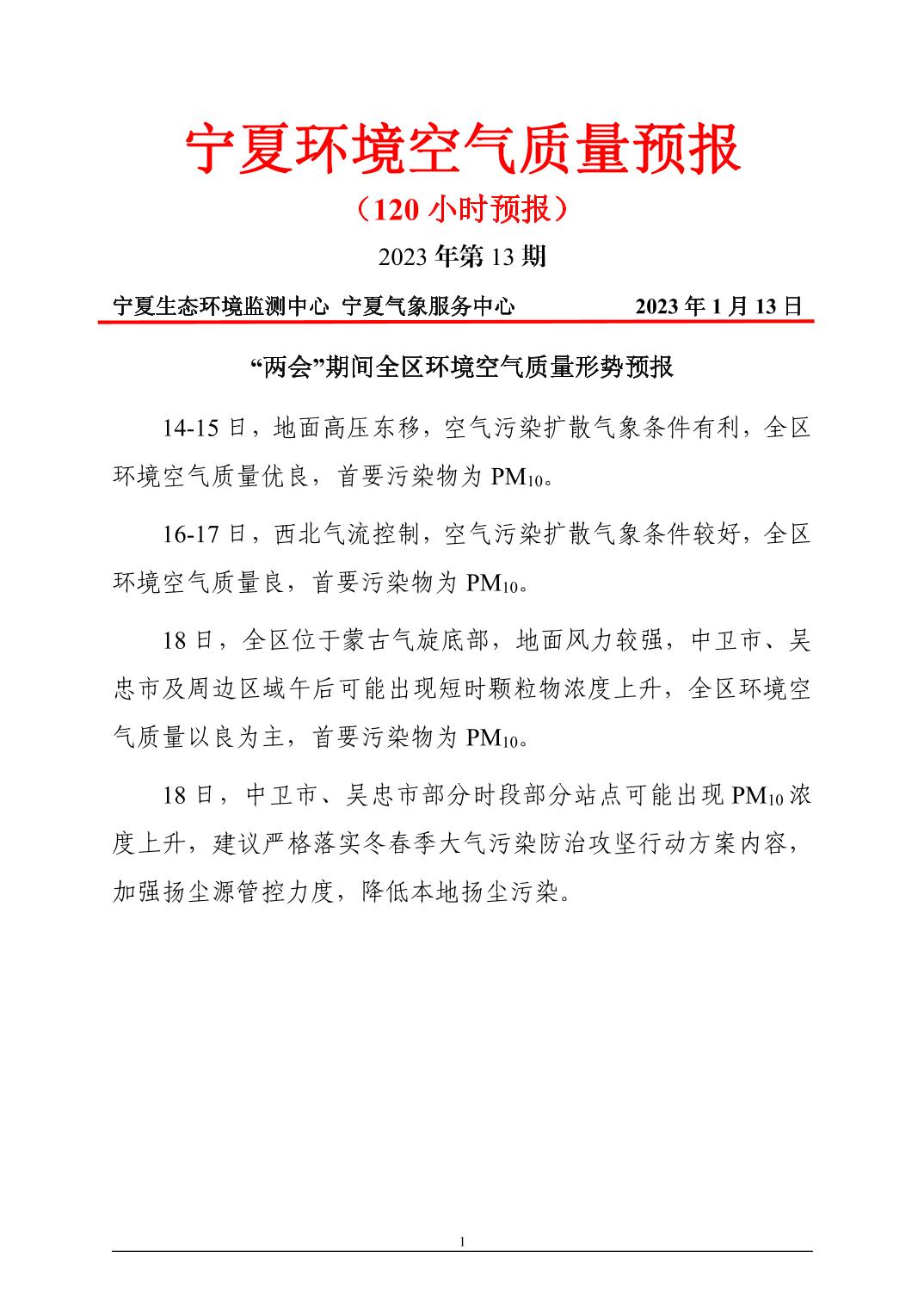 2023年1月13日宁夏环境空气质量预报信息