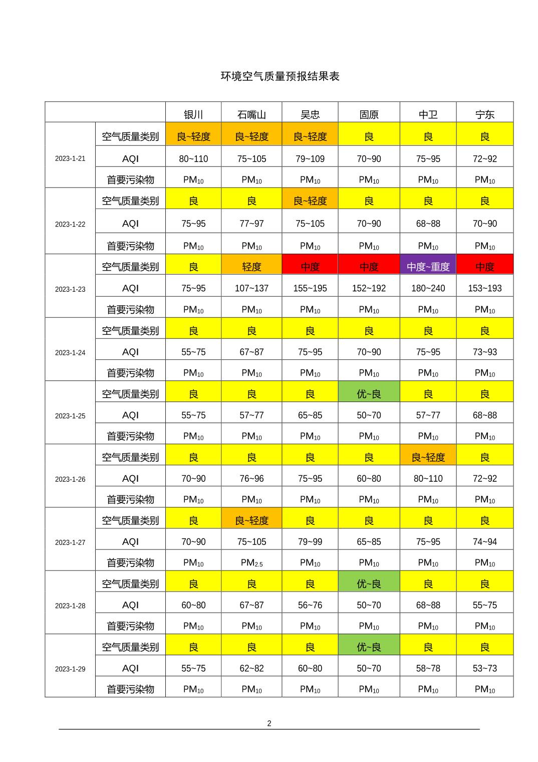 2023年1月20日宁夏环境空气质量预报信息
