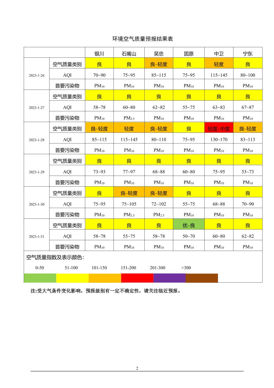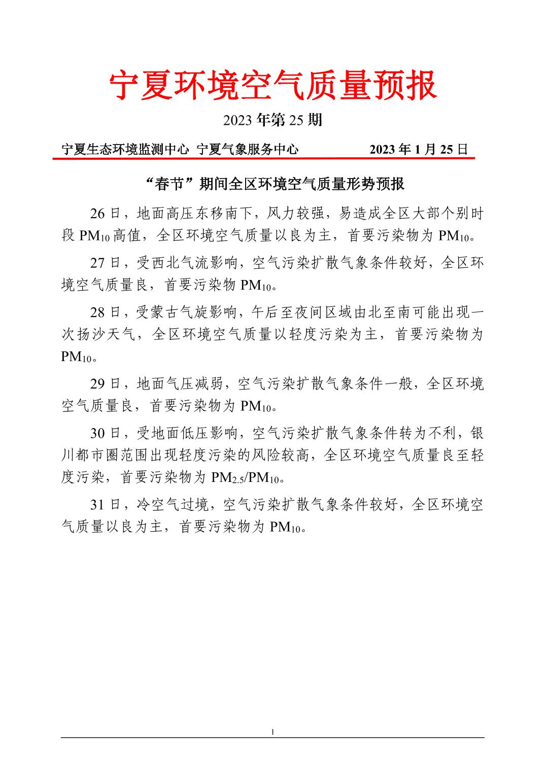 2023年1月25日宁夏环境空气质量预报信息