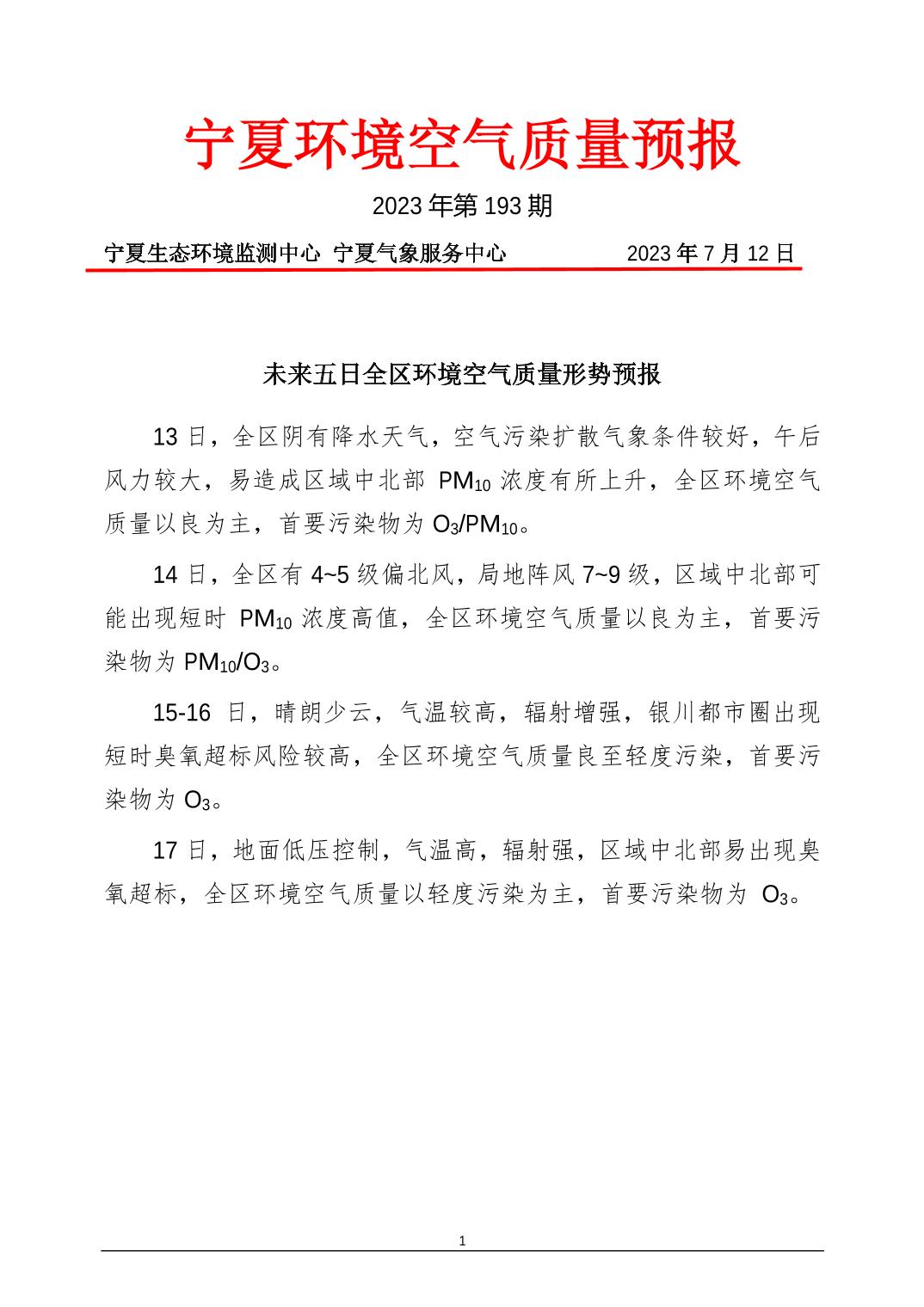 2023年7月12日宁夏环境空气质量预报信息