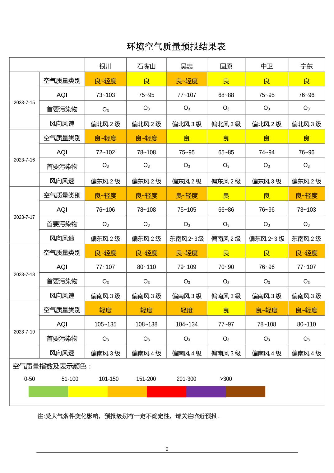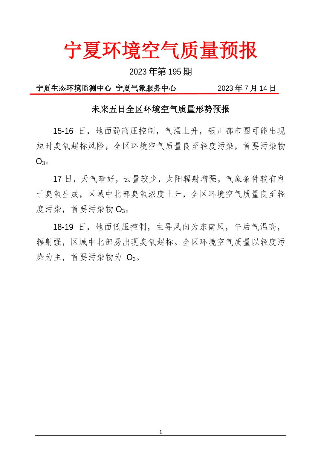 2023年7月14日宁夏环境空气质量预报信息