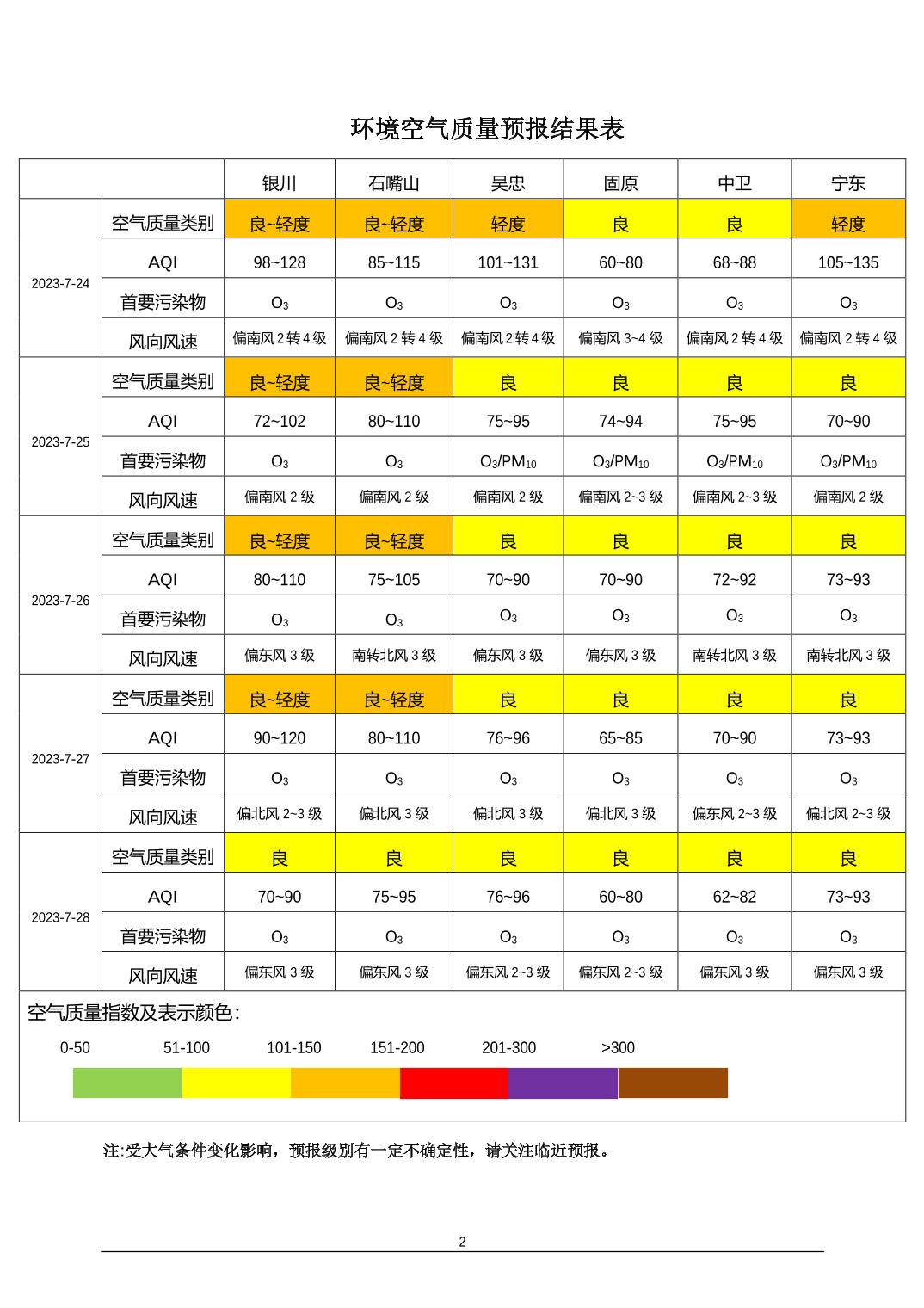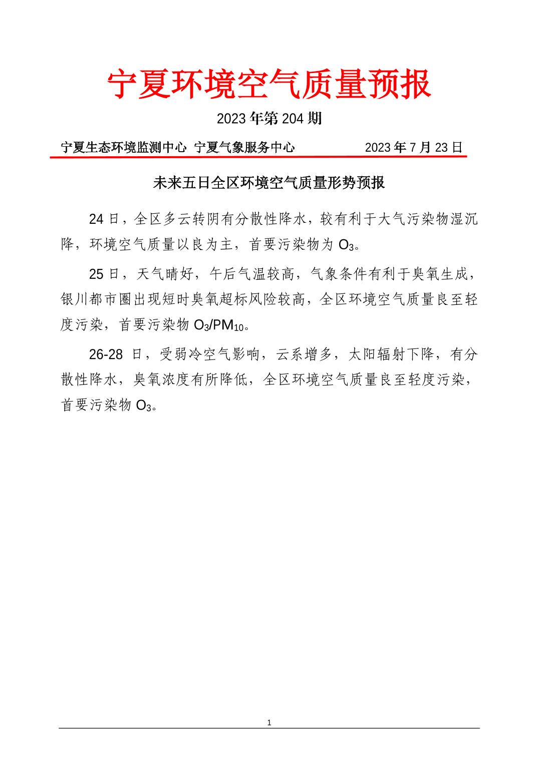 2023年7月23日宁夏环境空气质量预报信息