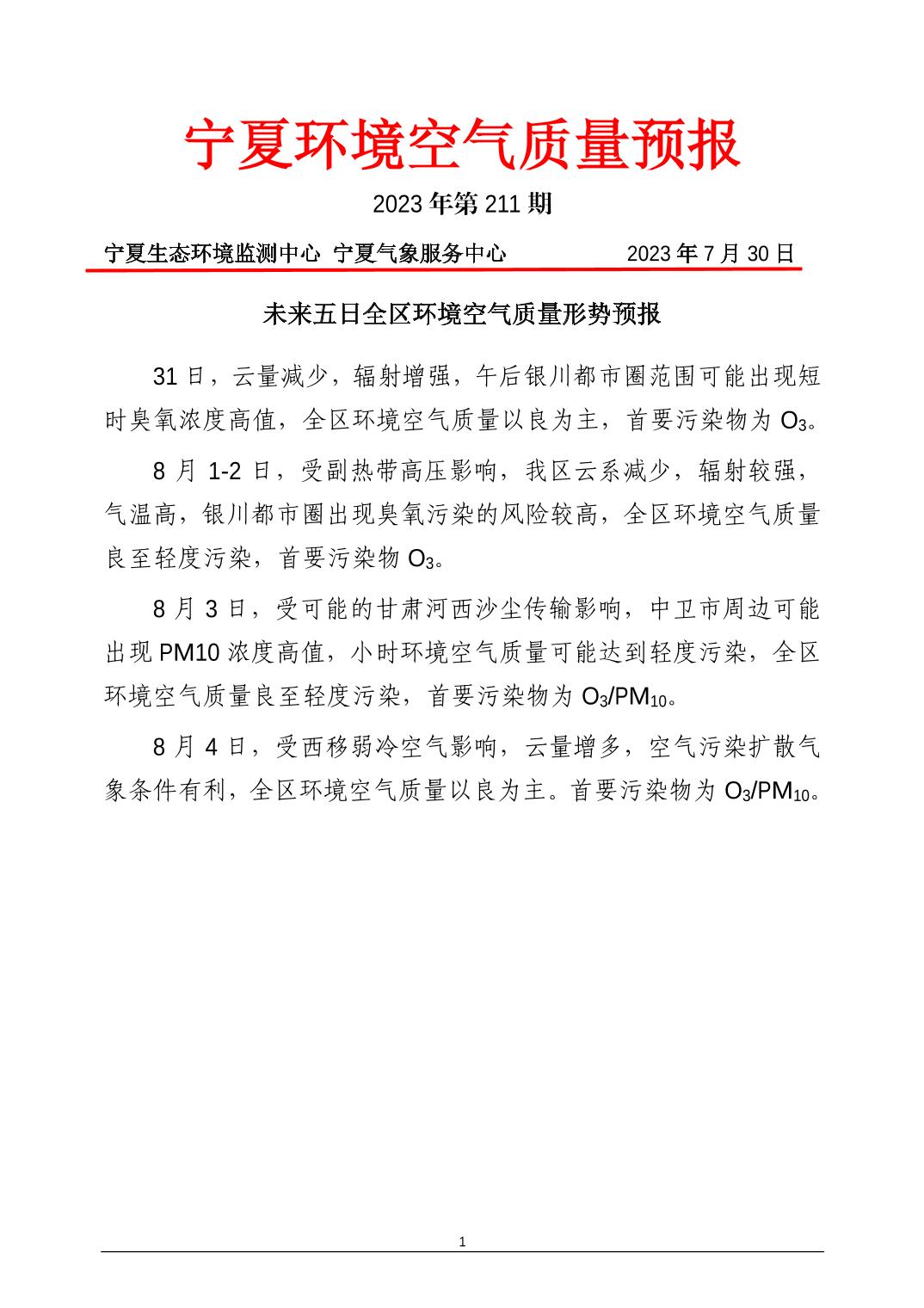 2023年7月30日宁夏环境空气质量预报信息