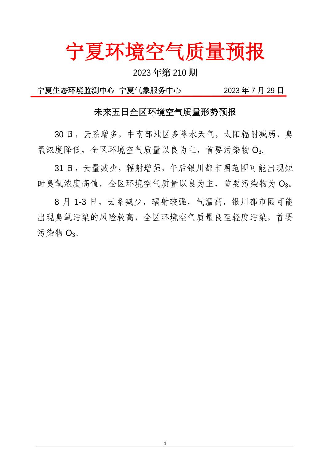 2023年7月29日宁夏环境空气质量预报信息