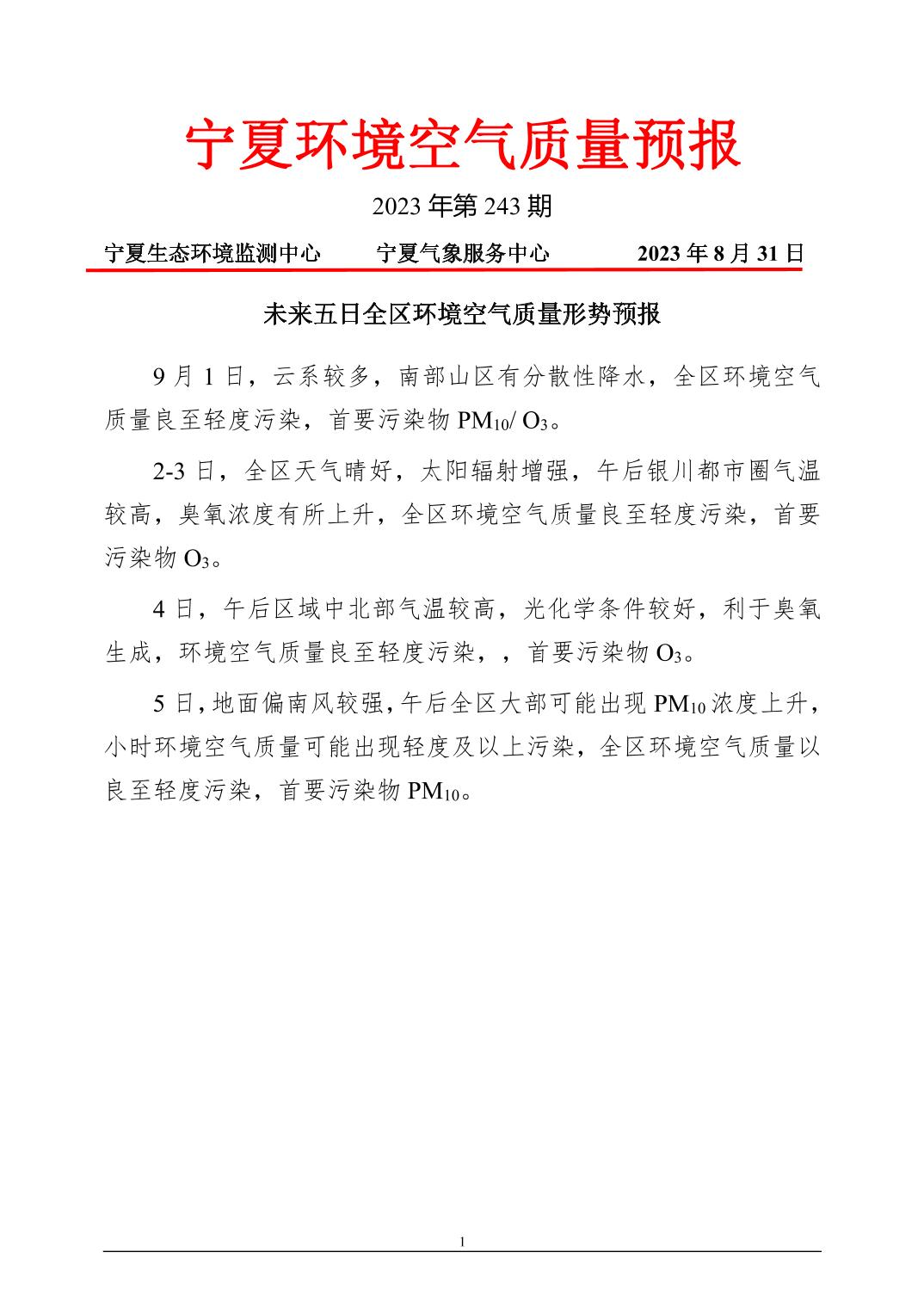 2023年8月31日宁夏环境空气质量预报信息