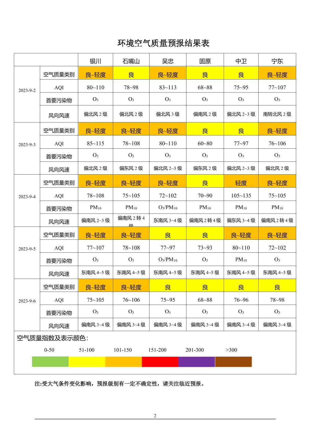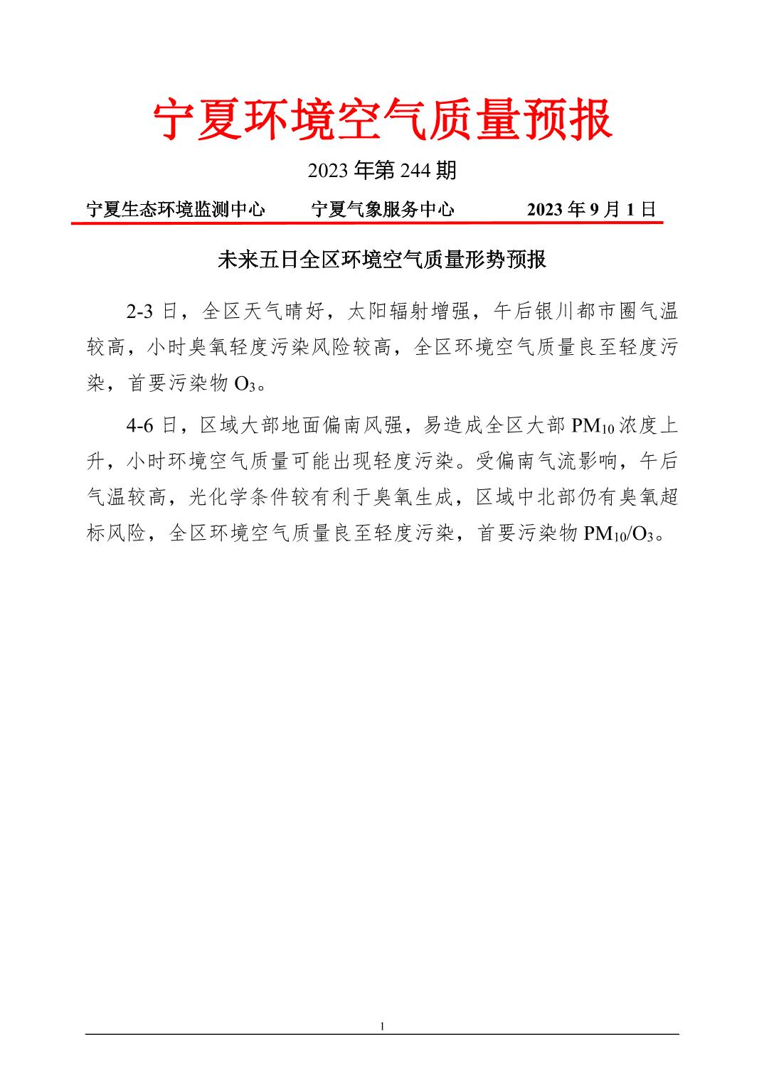 2023年9月1日宁夏环境空气质量预报信息