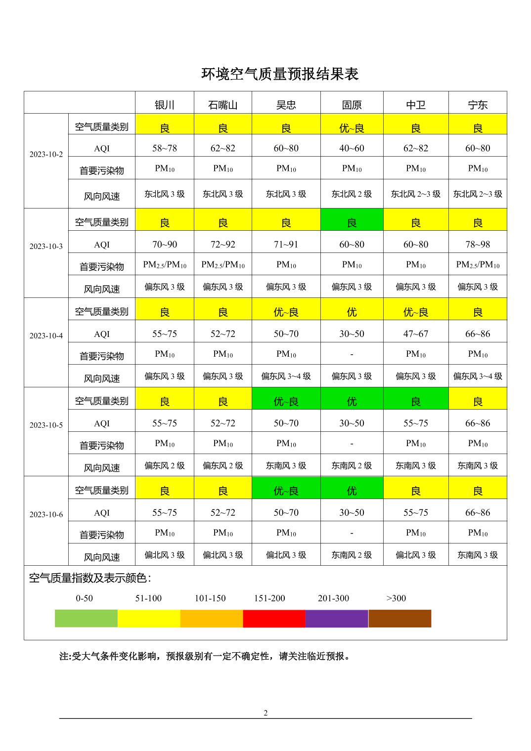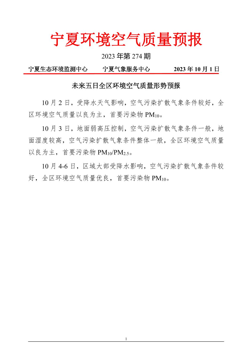 2023年10月1日宁夏环境空气质量预报信息