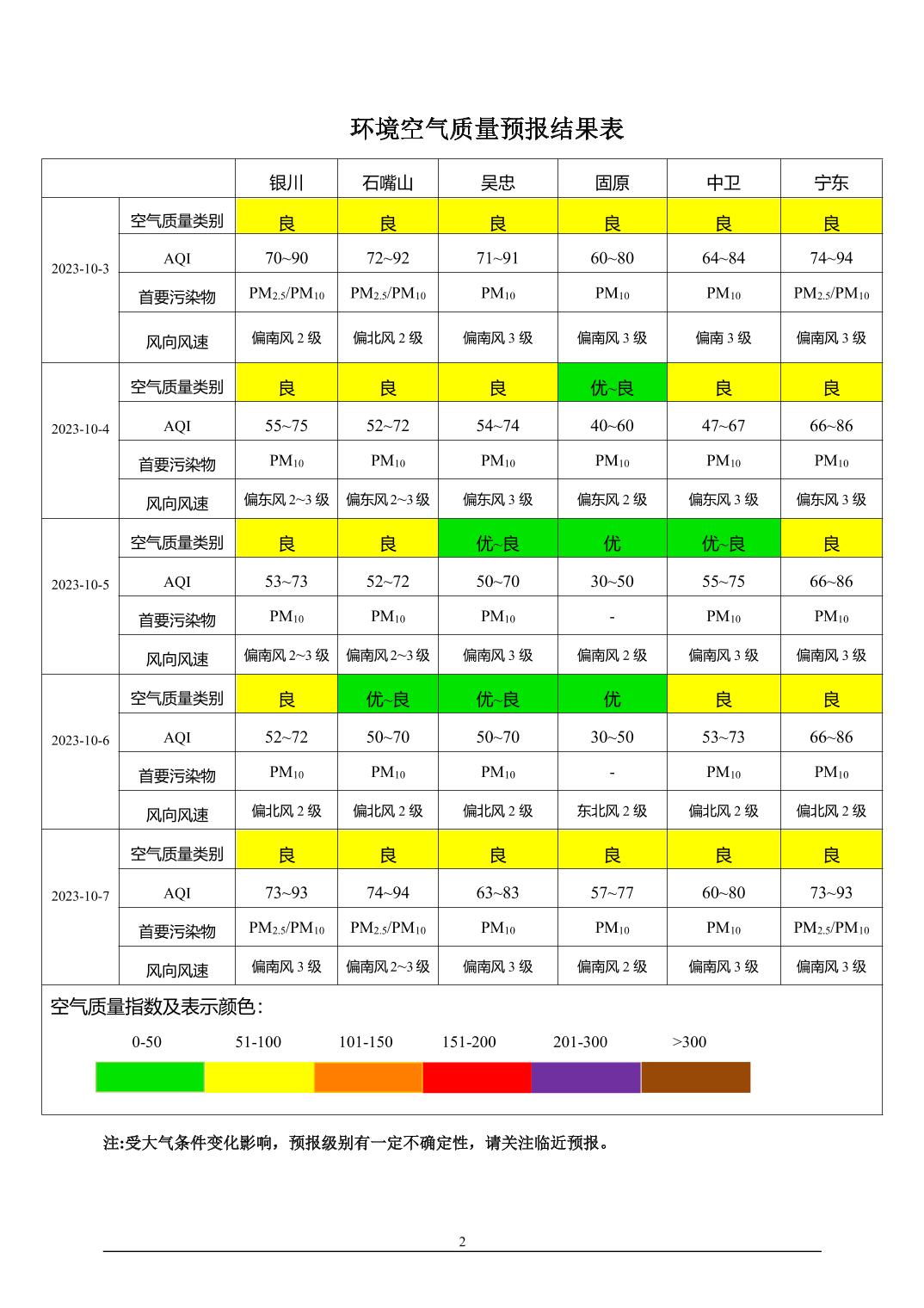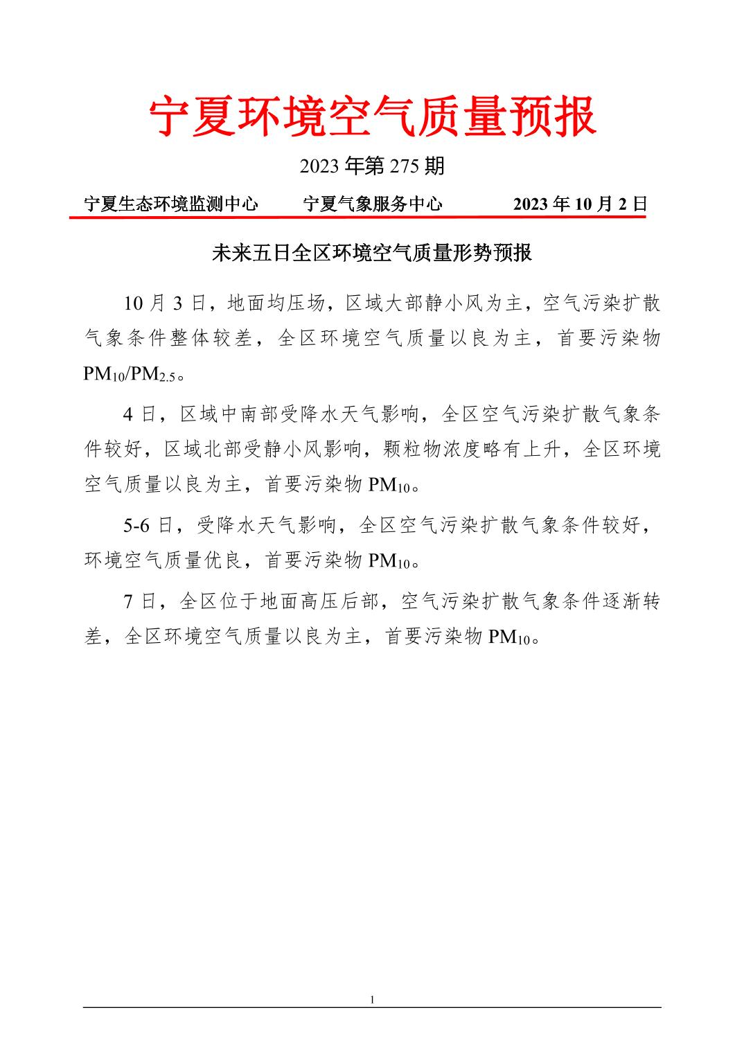 2023年10月2日宁夏环境空气质量预报信息