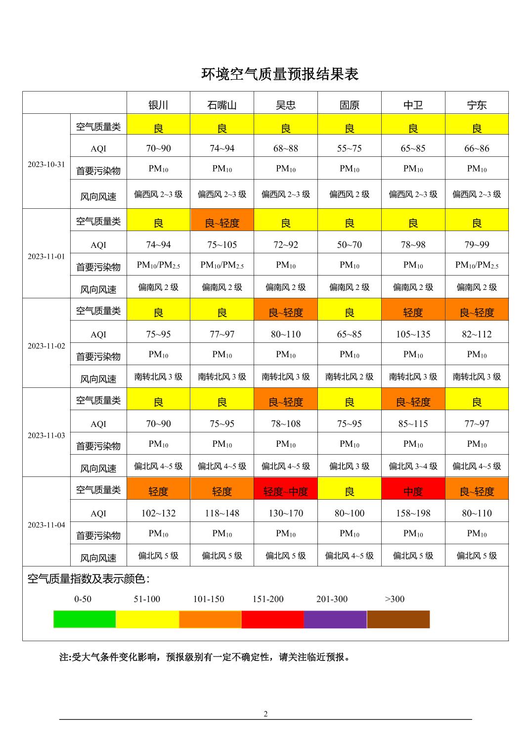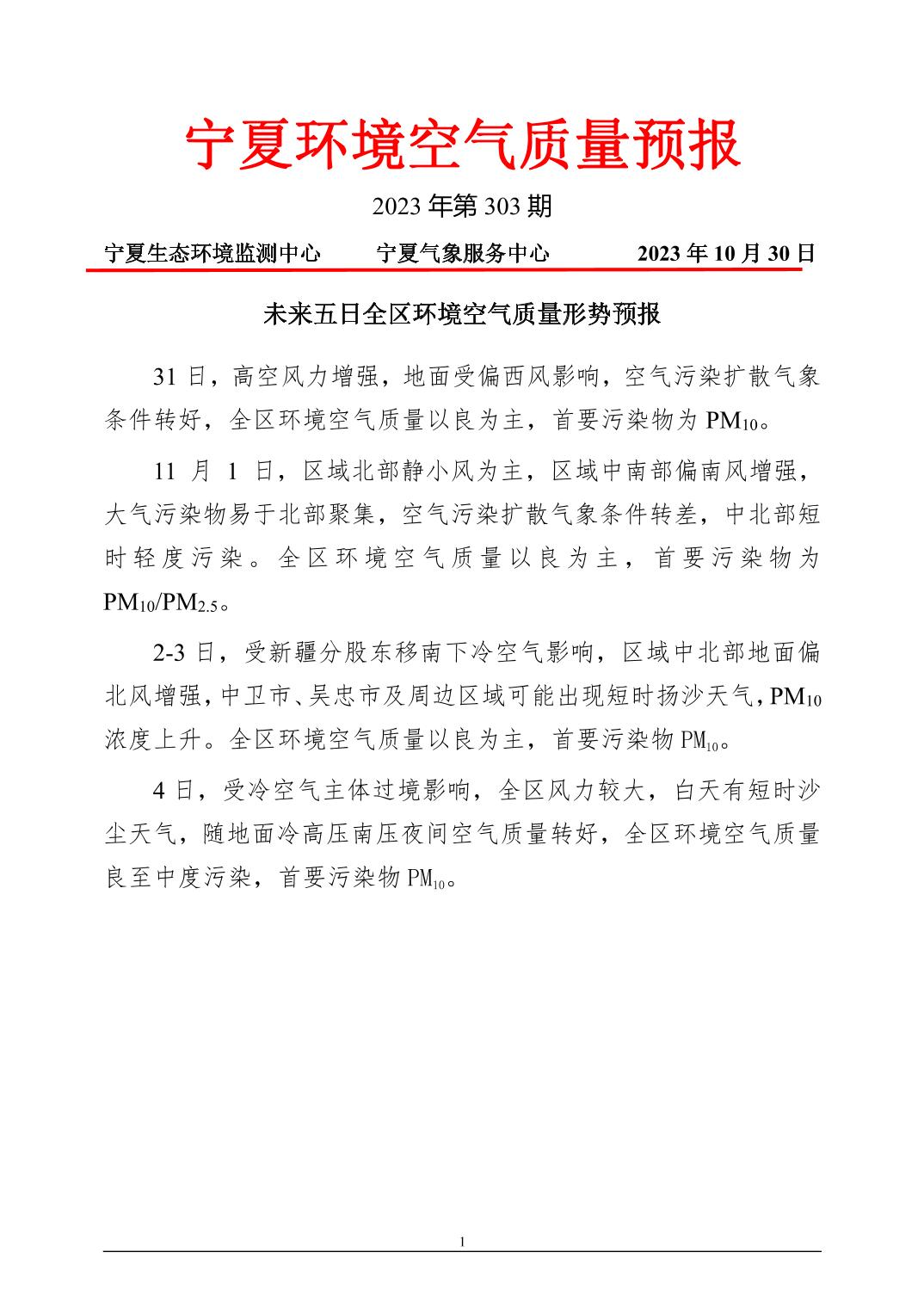 2023年10月30日宁夏环境空气质量预报信息