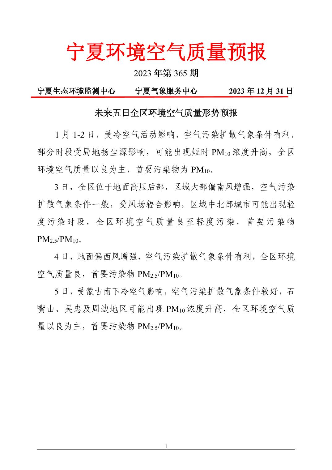 2023年12月31日宁夏环境空气质量预报信息