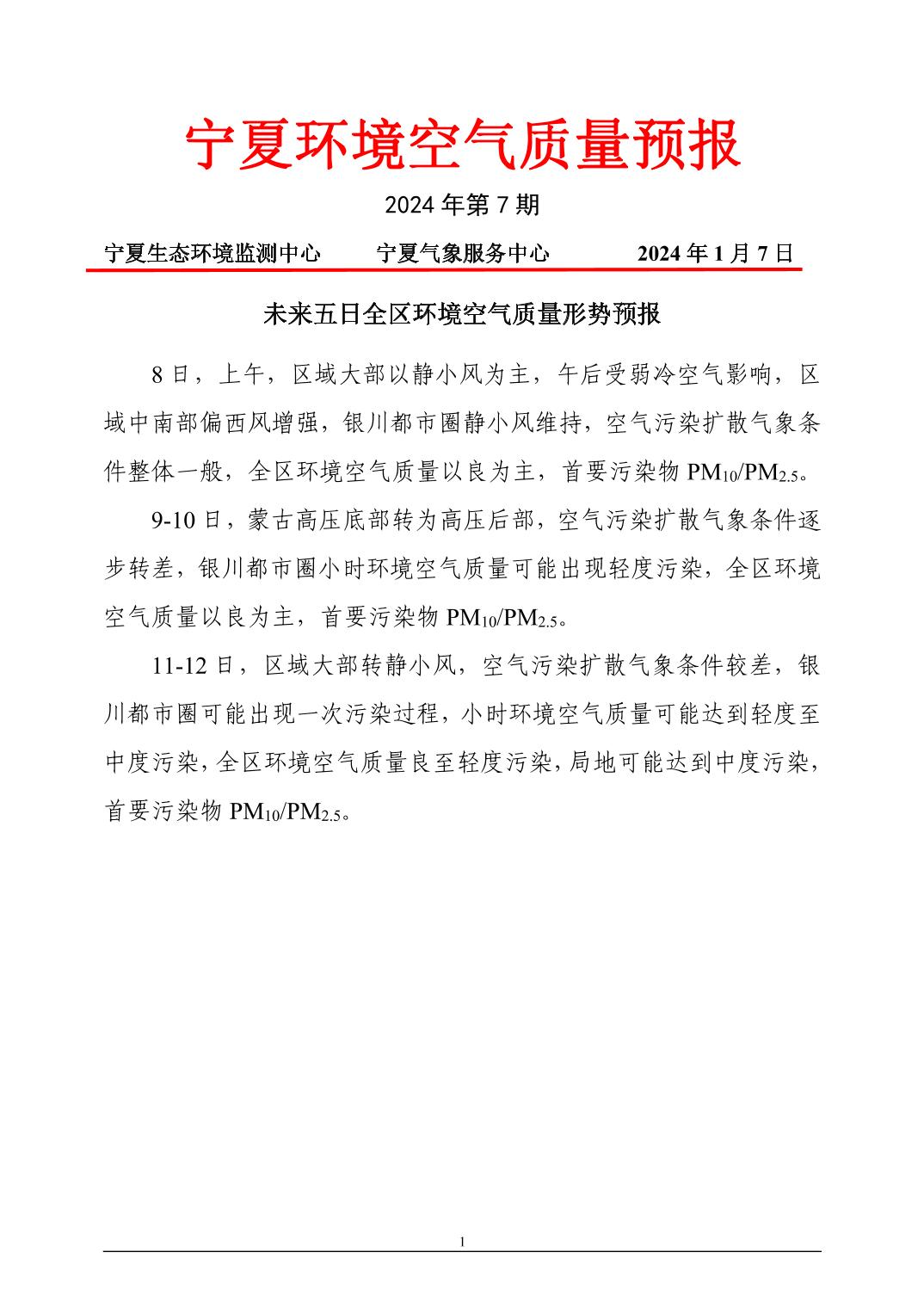 2024年1月7日宁夏环境空气质量预报信息