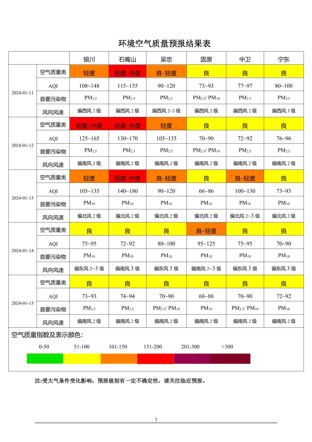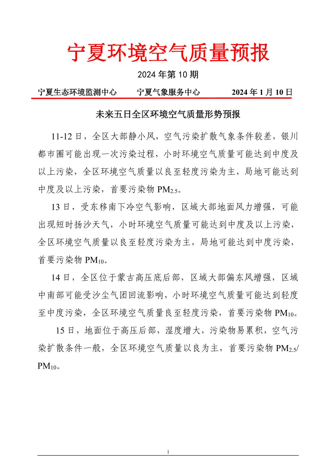 2024年1月10日宁夏环境空气质量预报信息