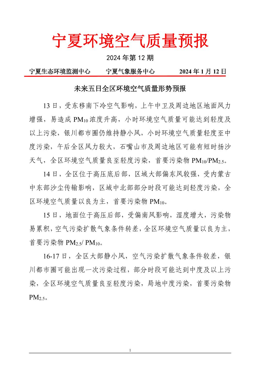 2024年1月12日宁夏环境空气质量预报信息