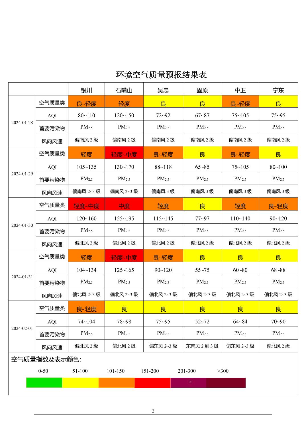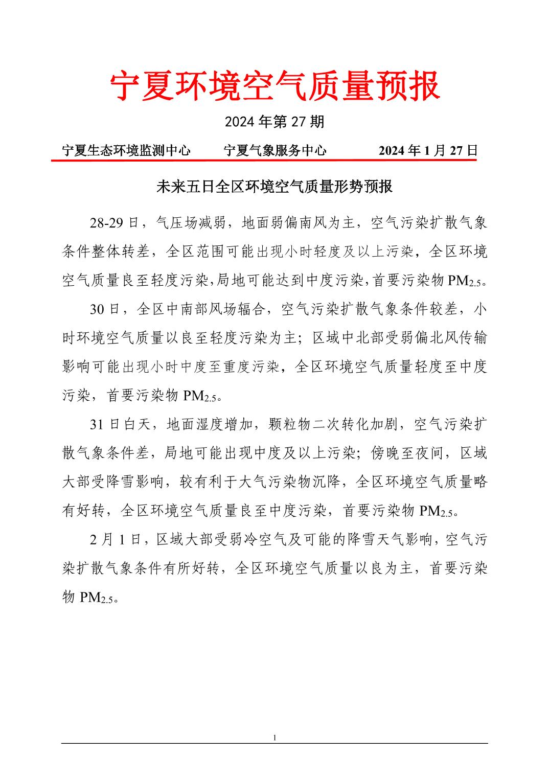 2024年1月27日宁夏环境空气质量预报信息