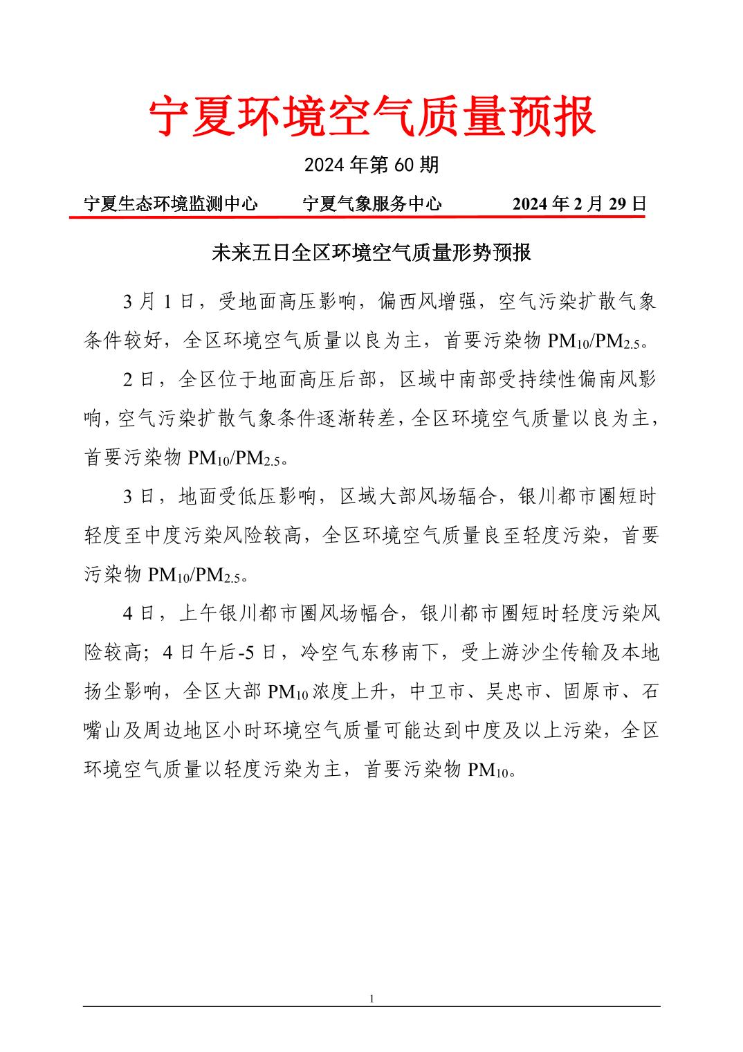 2024年2月29日宁夏环境空气质量预报信息