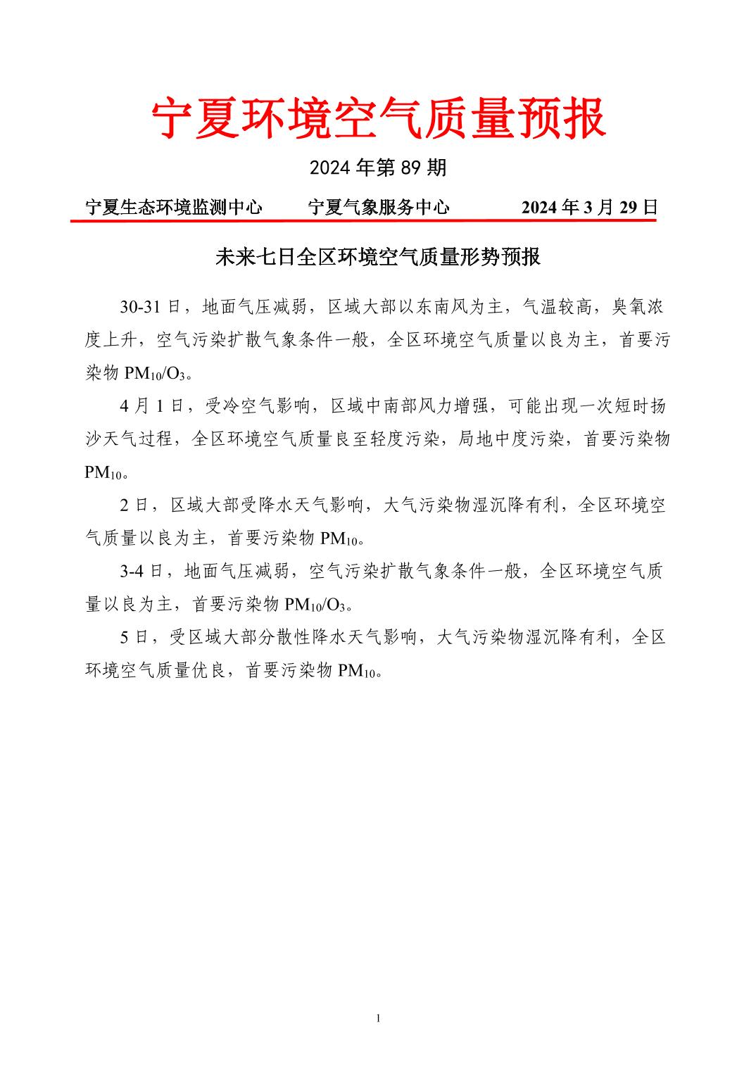 2024年3月29日宁夏环境空气质量预报信息
