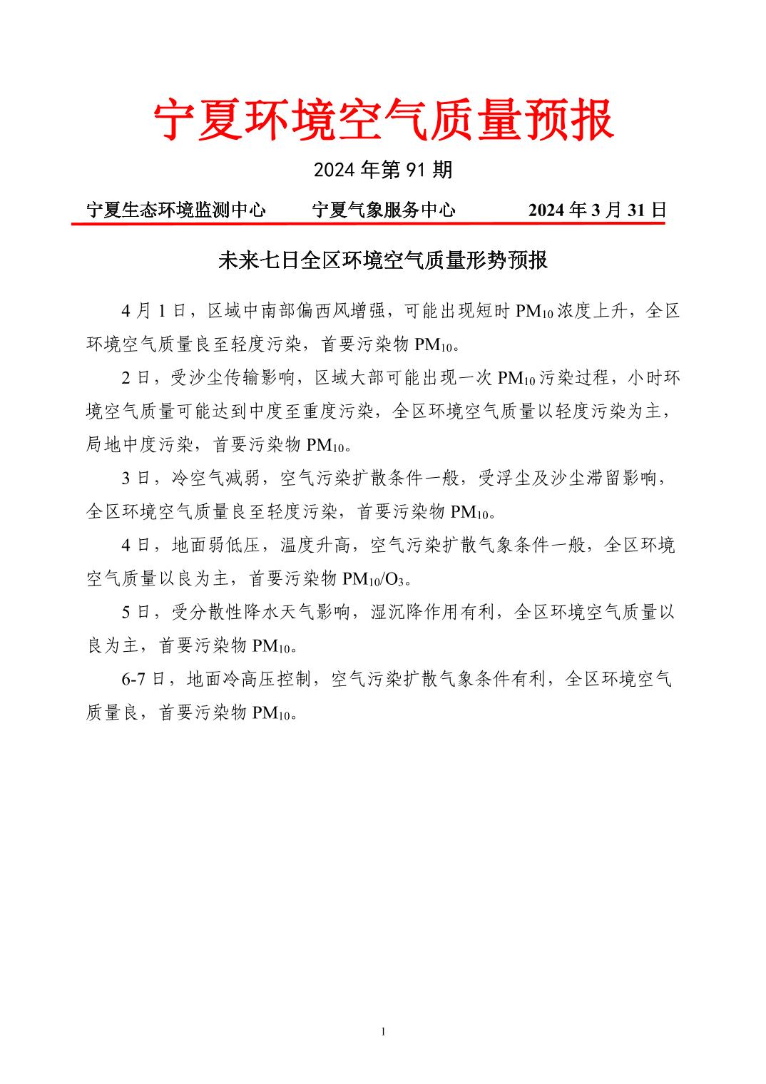 2024年3月31日宁夏环境空气质量预报信息