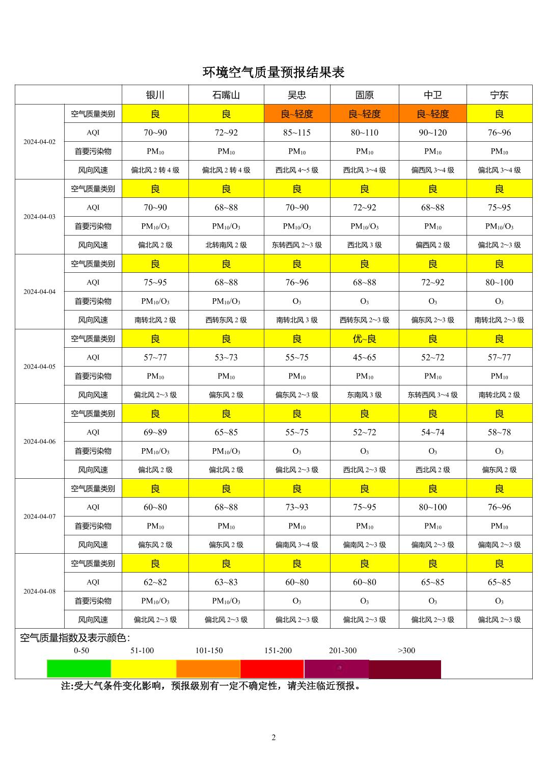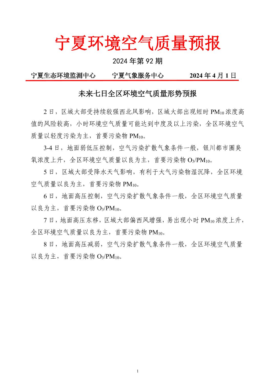 2024年4月1日宁夏环境空气质量预报信息