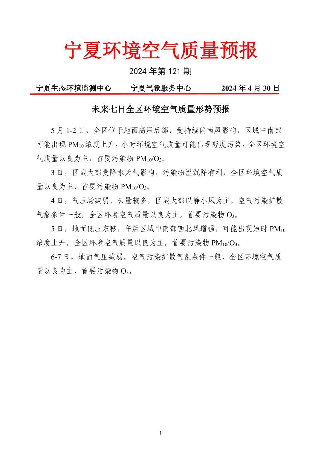 2024年4月30日宁夏环境空气质量预报信息