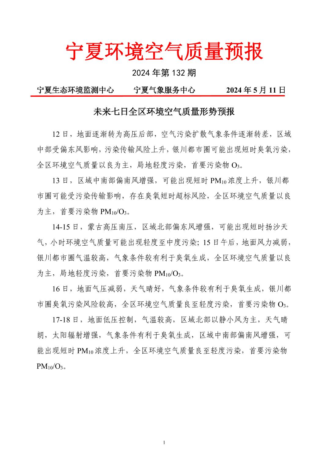 2024年5月11日宁夏环境空气质量预报信息