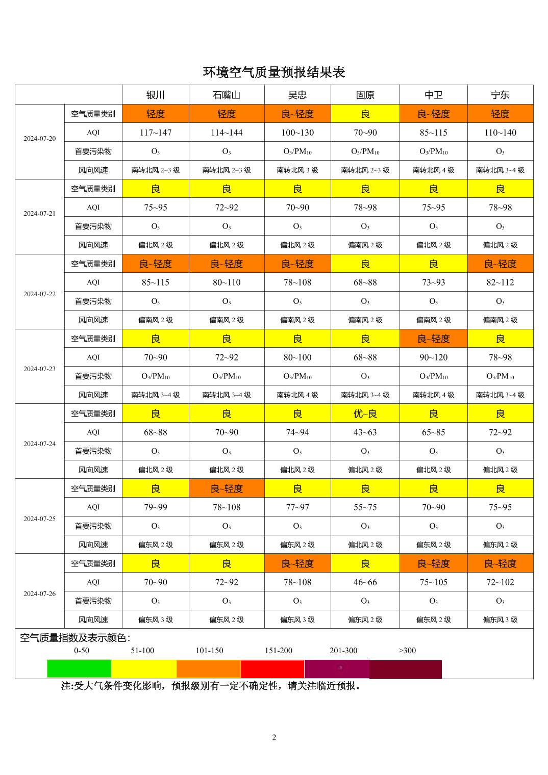 2024年7月19日宁夏环境空气质量预报信息