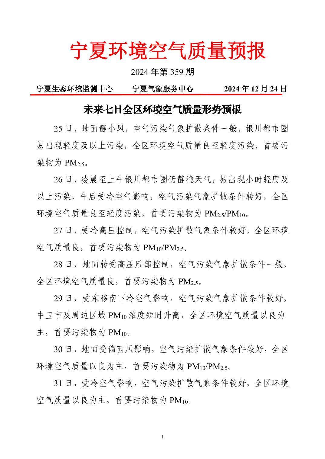 2024年12月24日宁夏环境空气质量预报信息