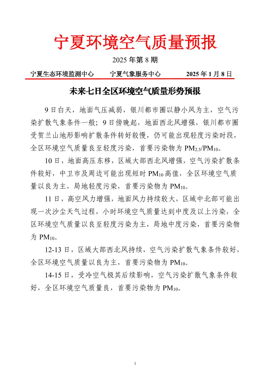 2025年1月8日宁夏环境空气质量预报信息