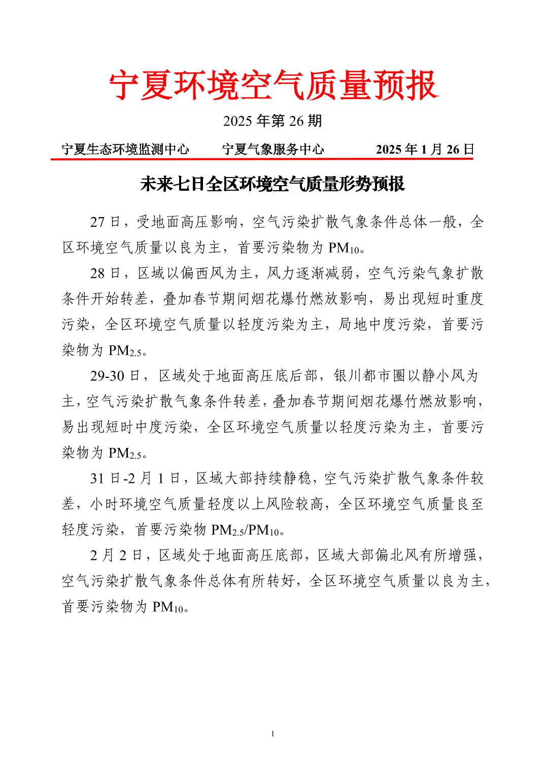 2025年1月26日宁夏环境空气质量预报信息