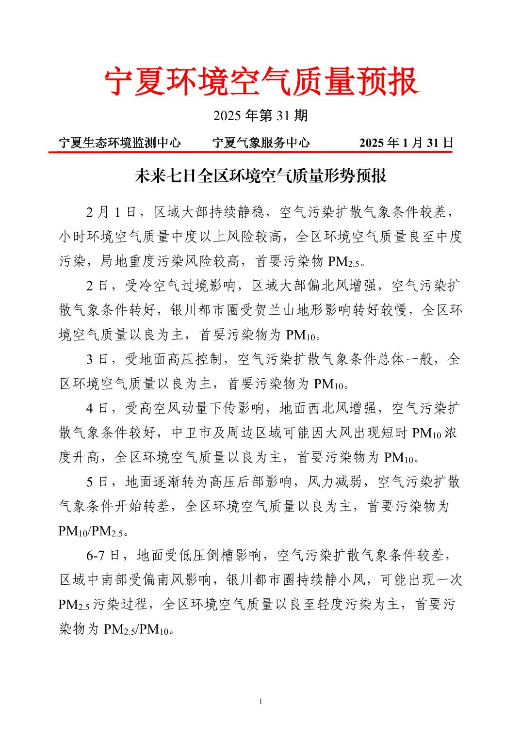 2025年1月31日宁夏环境空气质量预报信息