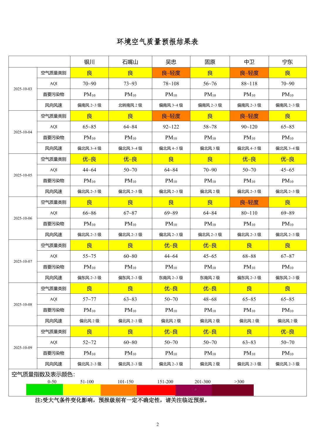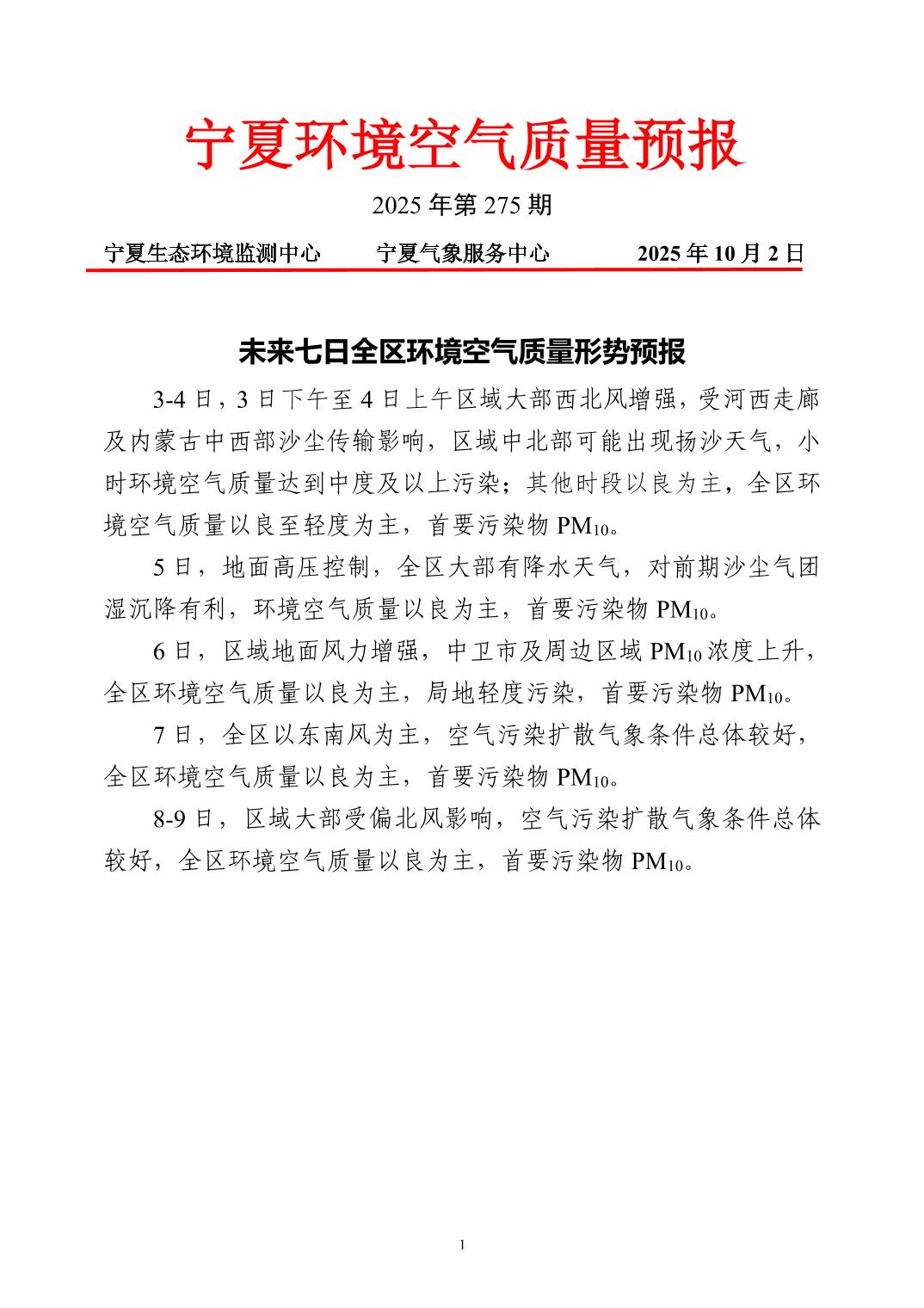 2025年10月2日宁夏环境空气质量预报信息