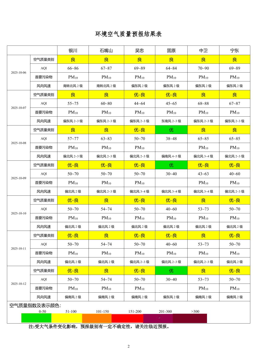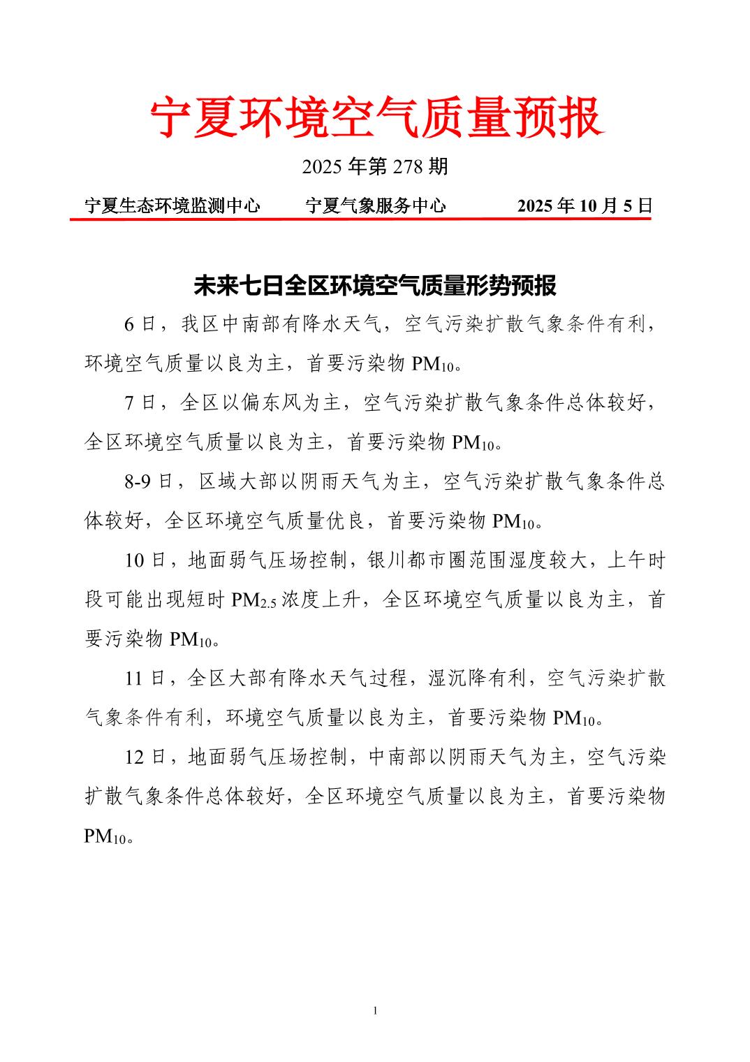 2025年10月5日宁夏环境空气质量预报信息