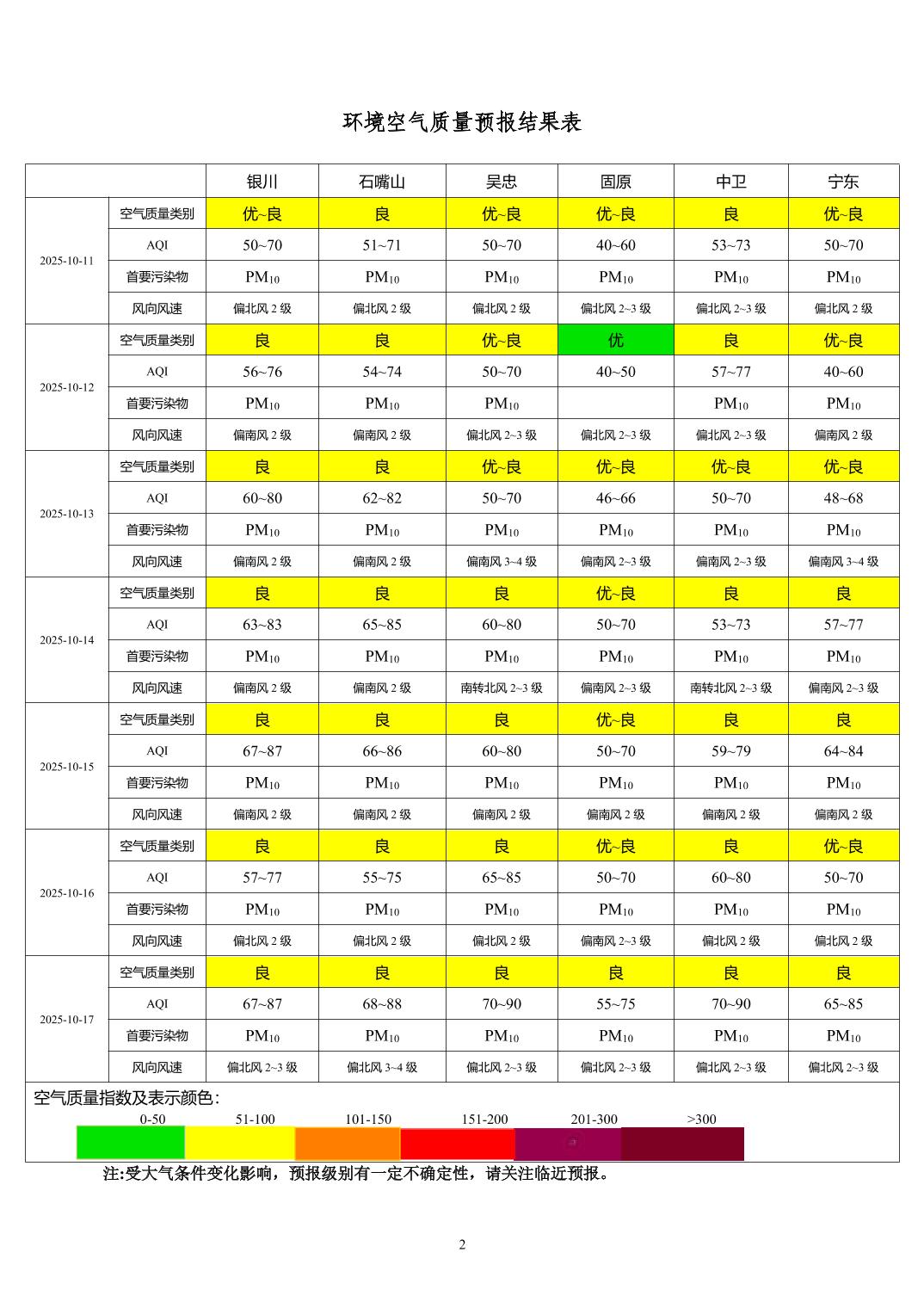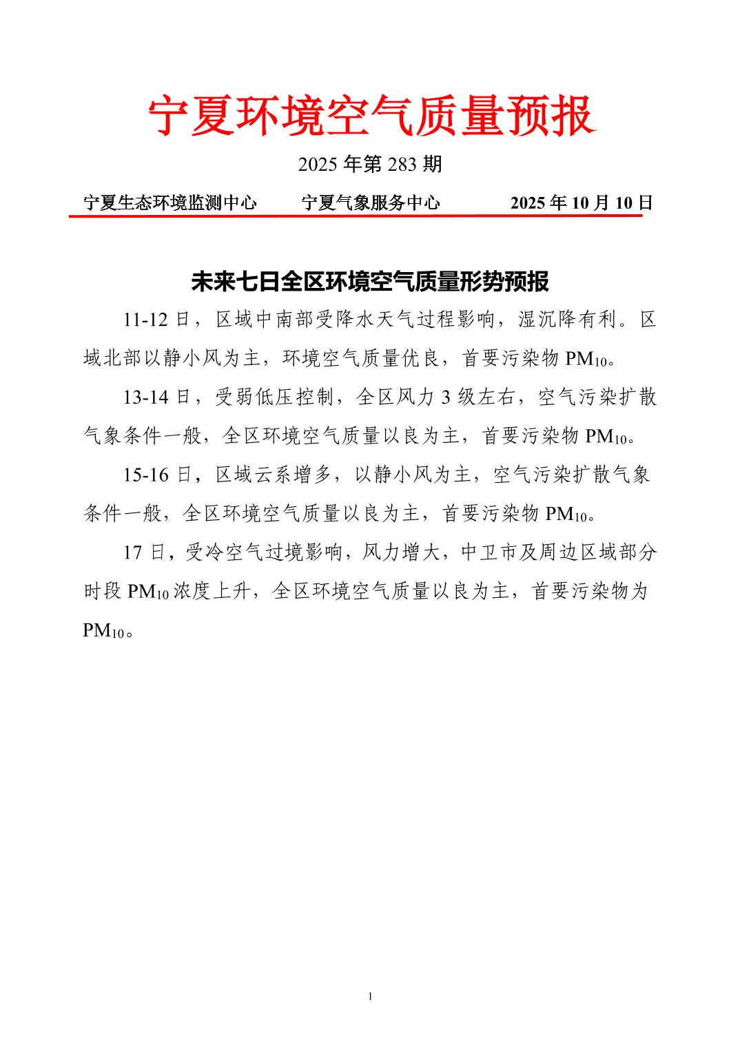 2025年10月10日宁夏环境空气质量预报信息