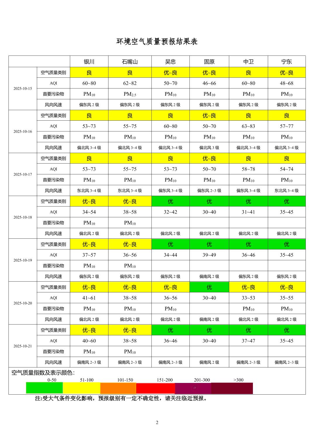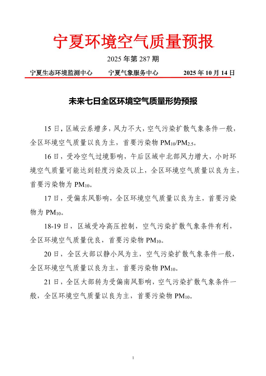 2025年10月14日宁夏环境空气质量预报信息