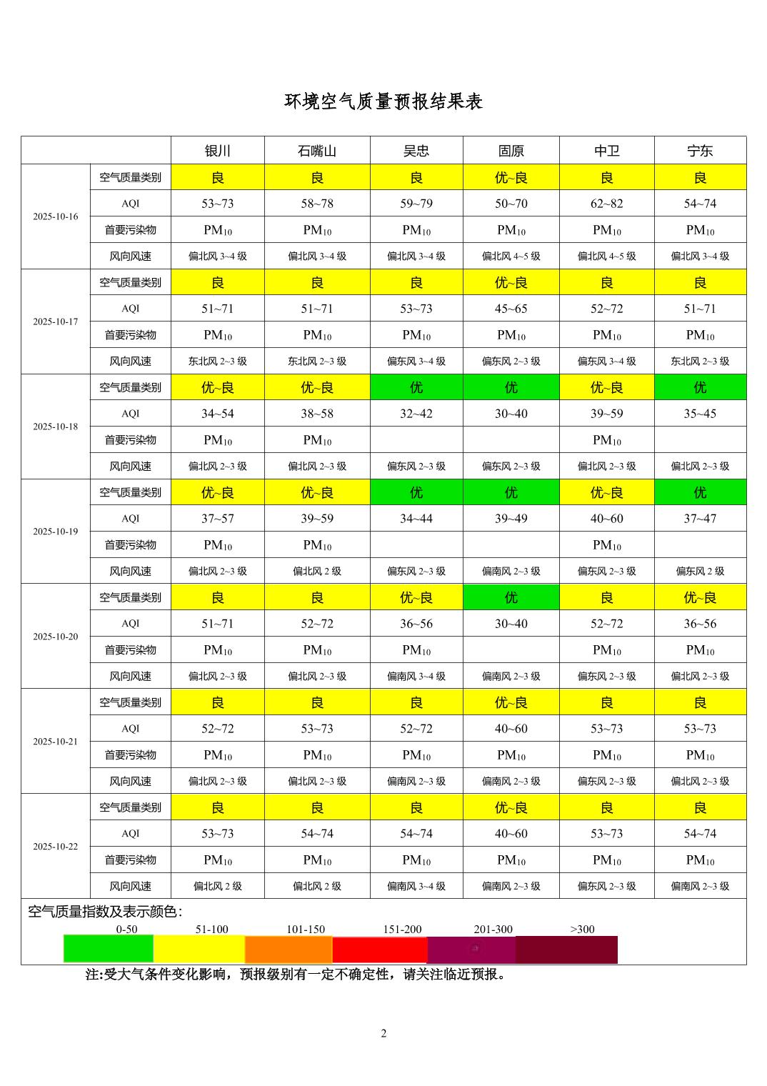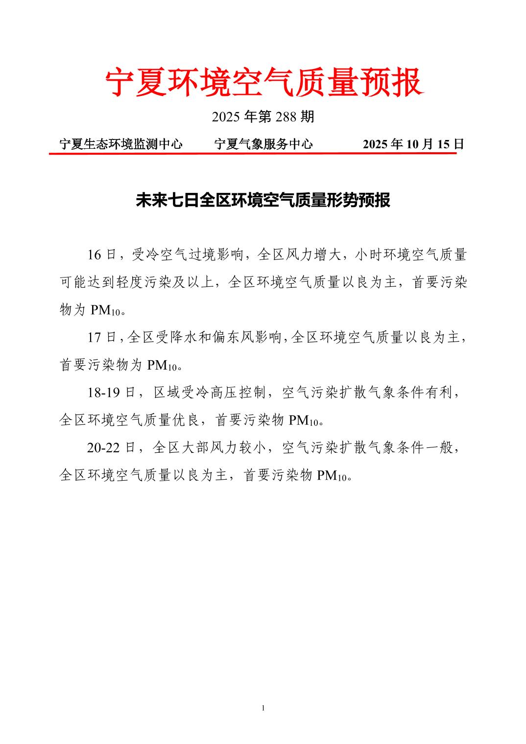 2025年10月15日宁夏环境空气质量预报信息