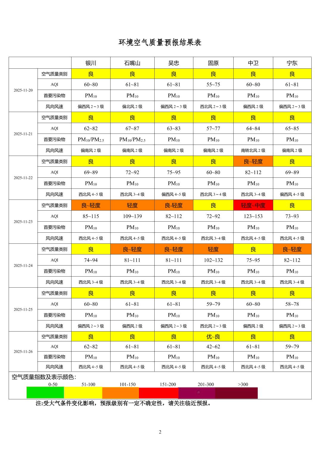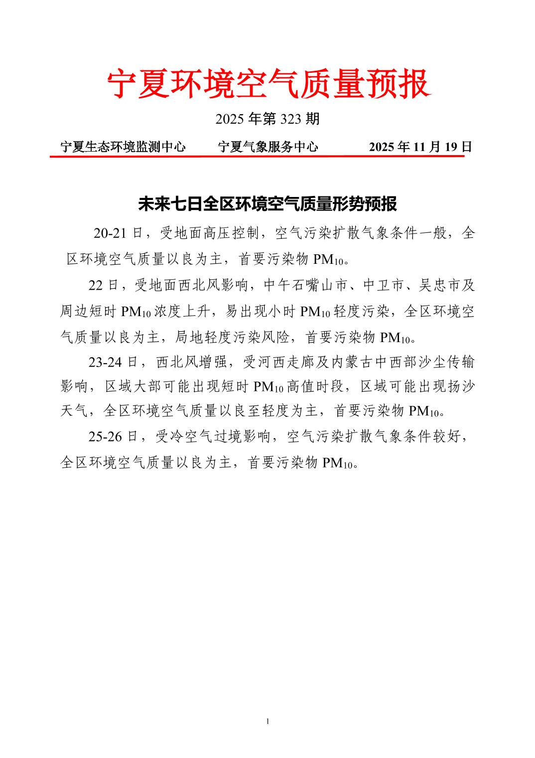 2025年11月19日宁夏环境空气质量预报信息