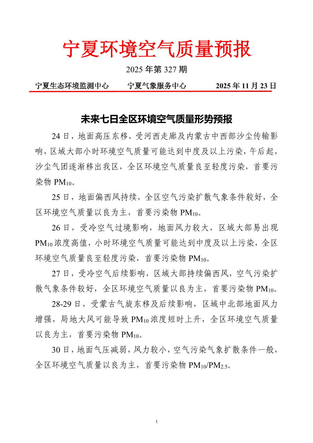 2025年11月23日宁夏环境空气质量预报信息
