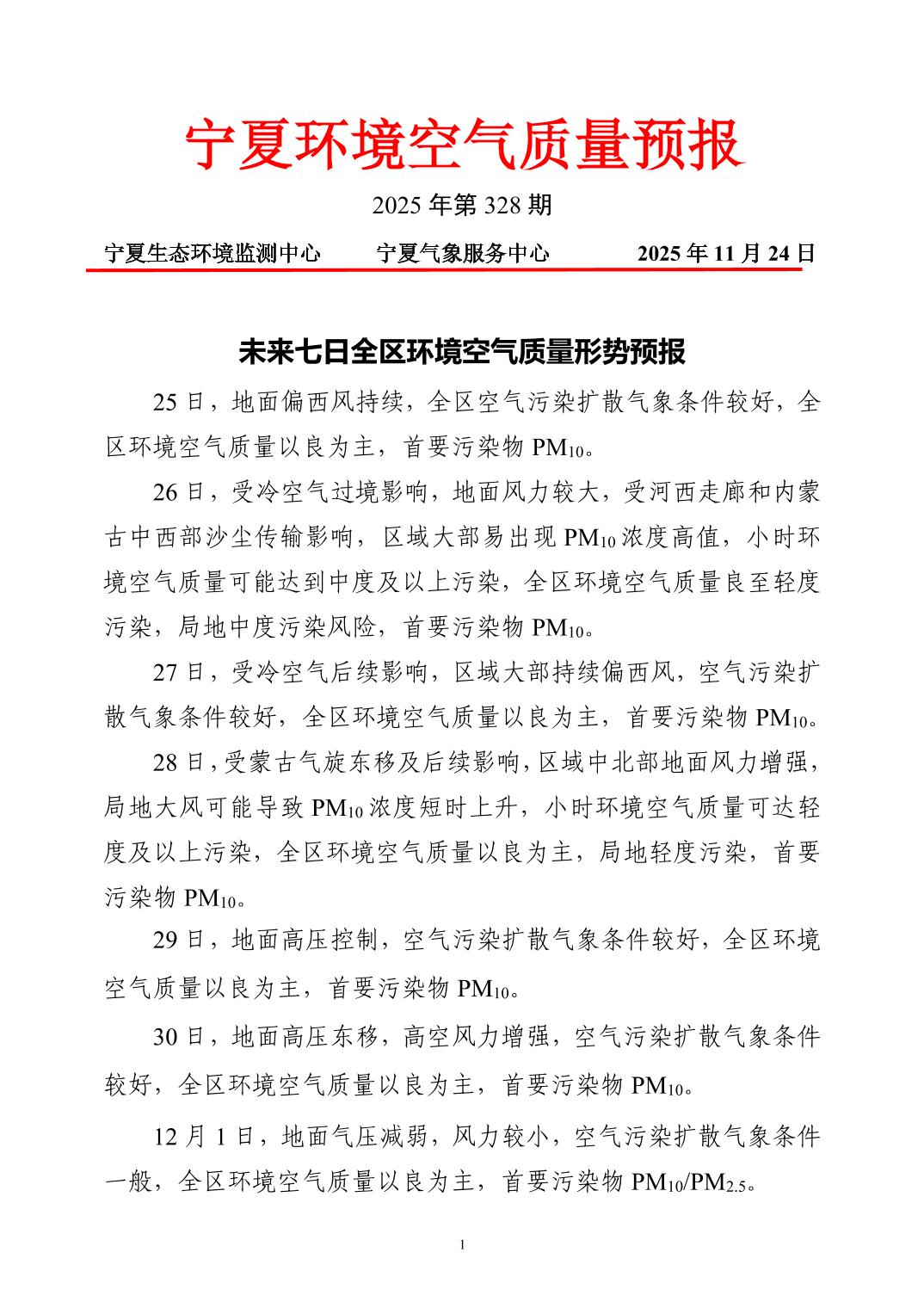 2025年11月24日宁夏环境空气质量预报信息